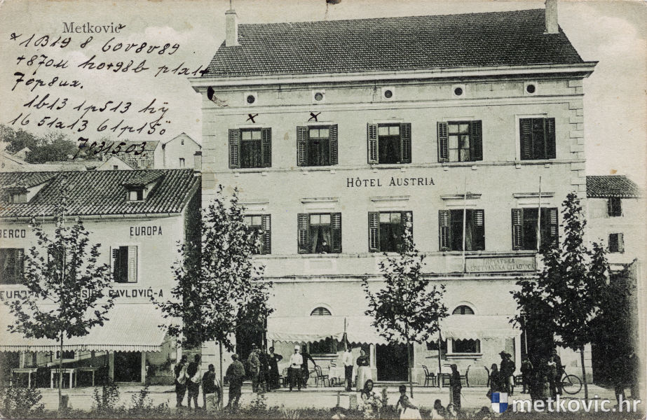 Vratimo se plitici. Očito je da je netko koncem XIX. st. to znao to pa je graveru sugerirao što sve želi. Graver je malo pogriješio pa je napisao Metkovich, ali je zato (hrvatski) napisao Austrija, umjesto Austria, kako se hotel zvao, a što je vidljivo iz priložene razglednice. Na njoj se vidi da je, kada je fotografija snimljena, tamo bila i poznata Hrvatska narodna čitaonica, a uz zgradu hotela bila je Gostionica Europa vlasnika Josipa Pavlovića. Napisano je PAVLOVIĆ-A, upravo kako se još uvijek mnogim medijima zna „zalomiti“ pa napišu MOST-a, MOST-u…