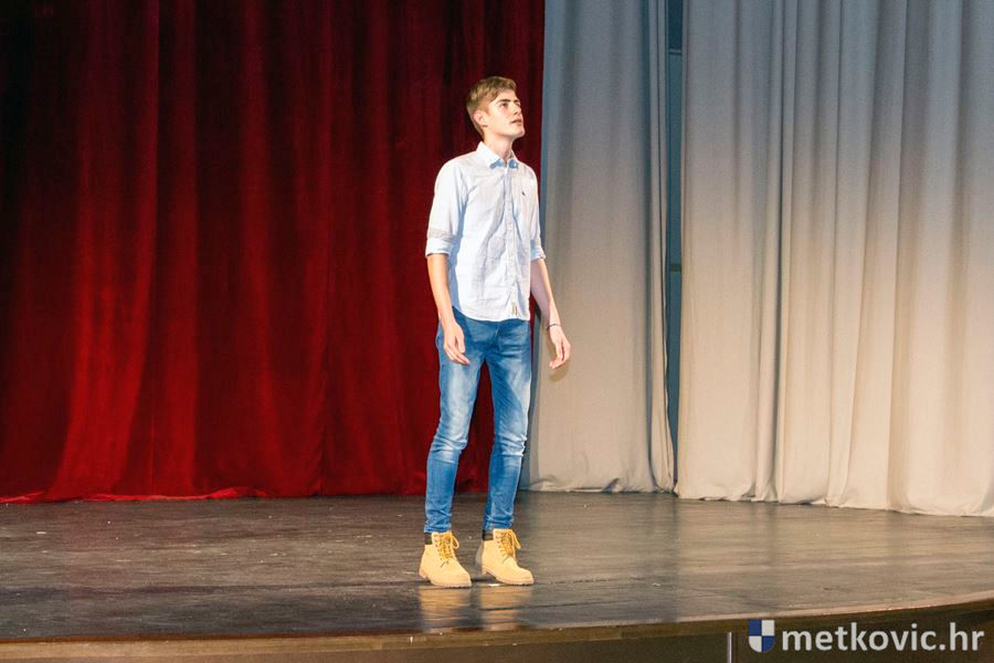 Za skupni scenski nastup E. Ionesco: Ćelava pjevačica (ulomak), nagrađeni su učenici 3. r. Gimnazije Metković Božidar Bartulović, Karla Bebići Matej Mustapić, mentorica Ivanka Ujdur.