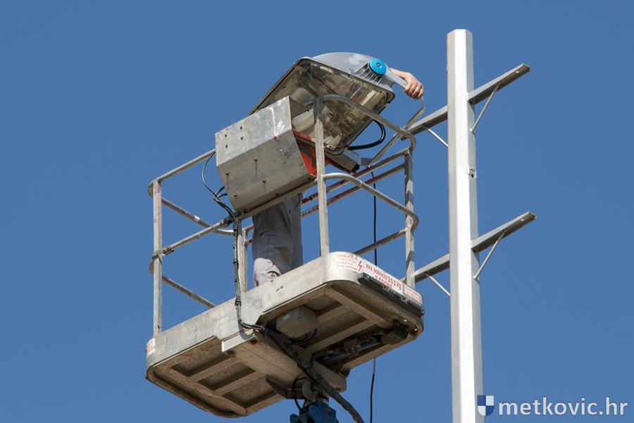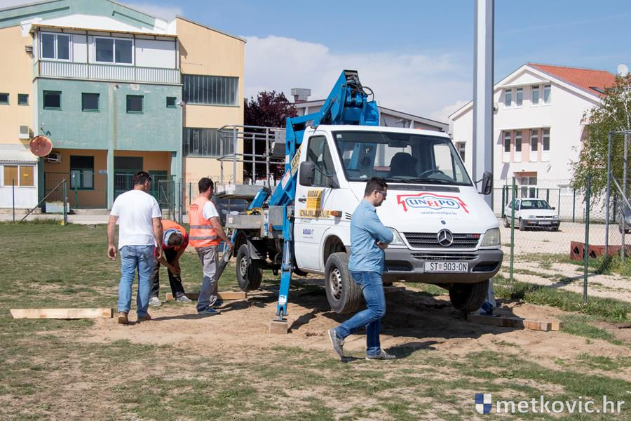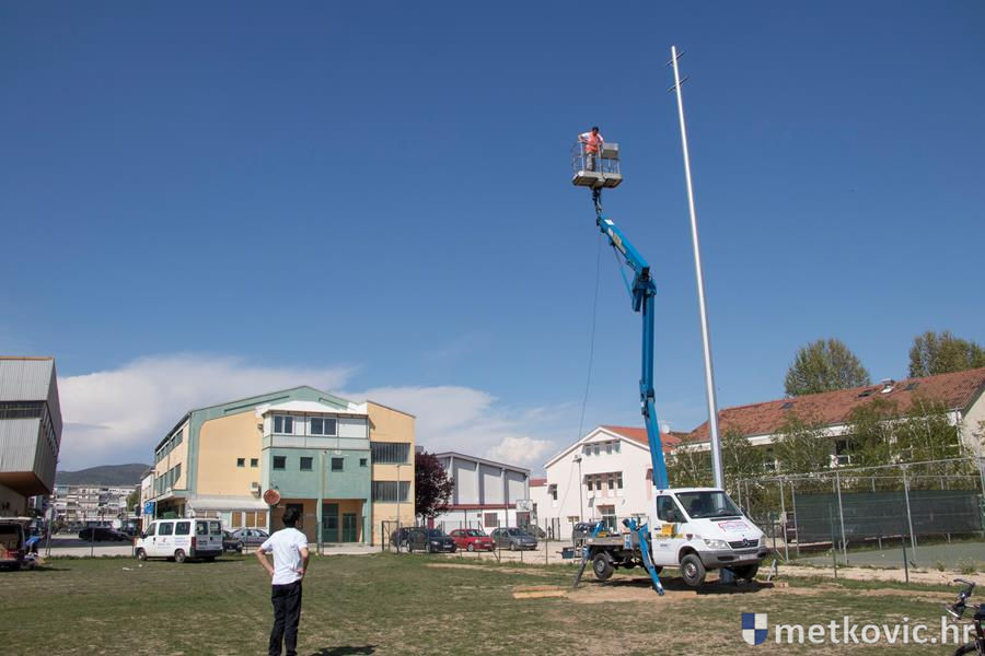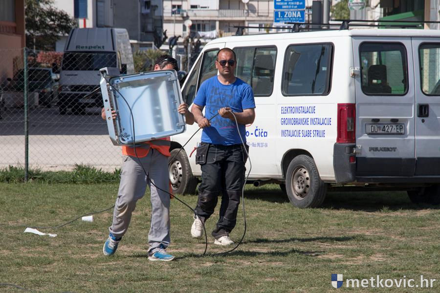 12.4.2017. - Nakon što su podignuti šesnaestmetarski rasvjetni stupovi na pomoćnome igralištu NK Neretva, jučer su na njih montirana po dva dvokilovatna halogena reflektora.