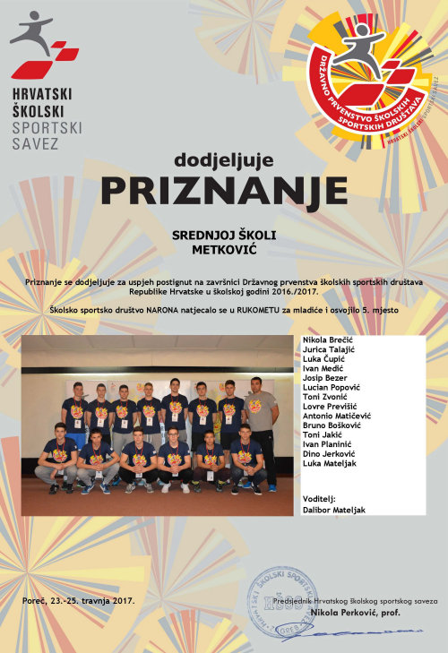 26.4.2017. - Prekjučer je u porečkoj dvorani Veli Jože održana završnica Državnoga prvenstva srednjoškolskih sportskih društava u rukometu za mladiće, na kojemu je sudjelovalo šest ekipa iz cijele Hrvatske, među njima i Školsko sportsko društvo Narona iz Srednje škole Metković.