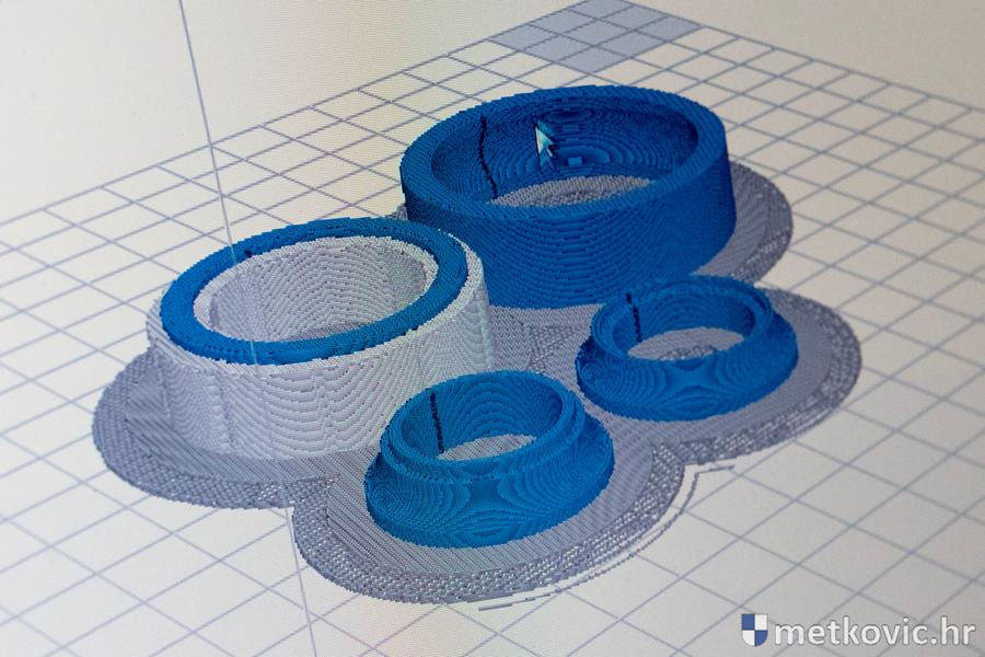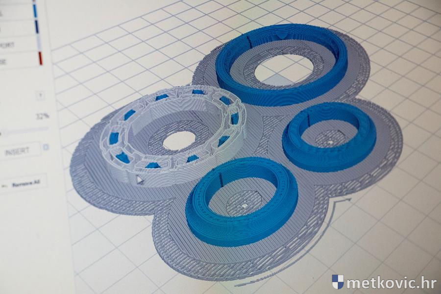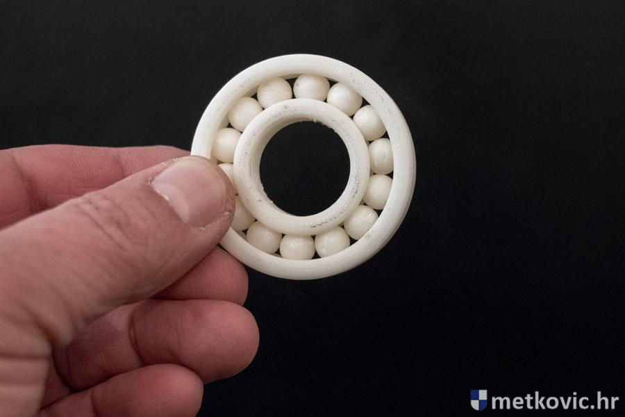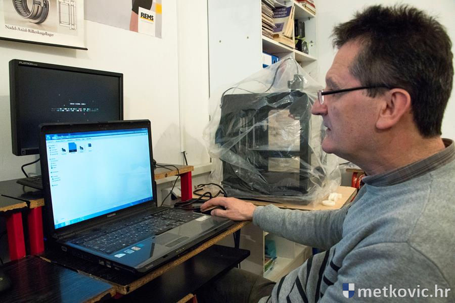Sam postupak printanja nismo vidjeli, jer bi trebalo čekati nekoliko sati, ali smo vidjeli potpuno funkcionalan kuglični ležaj te još neke predmete nastale pomoću toga uređaja. Prof. Medić nam je objasnio faze nastajanja modela u AutoCAD-u, njegova eksportiranja u poseban kôd za printanje te pojedinosti o samome printanju modela. Prije samoga printanja na računalu se mogu pratiti sve njegove faze te mijenjati željene postavke poput gustoće materijala i sl. Kaže da se danas na internetu može pronaći puno gotovih modela dijelova raznih strojeva i uređaja, što jako dobro dođe u nastavi jer to učenike motivira za rad. Da je to tako, dokazao je Ante Bačić.