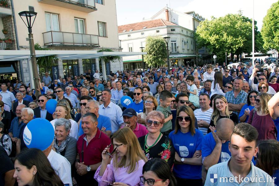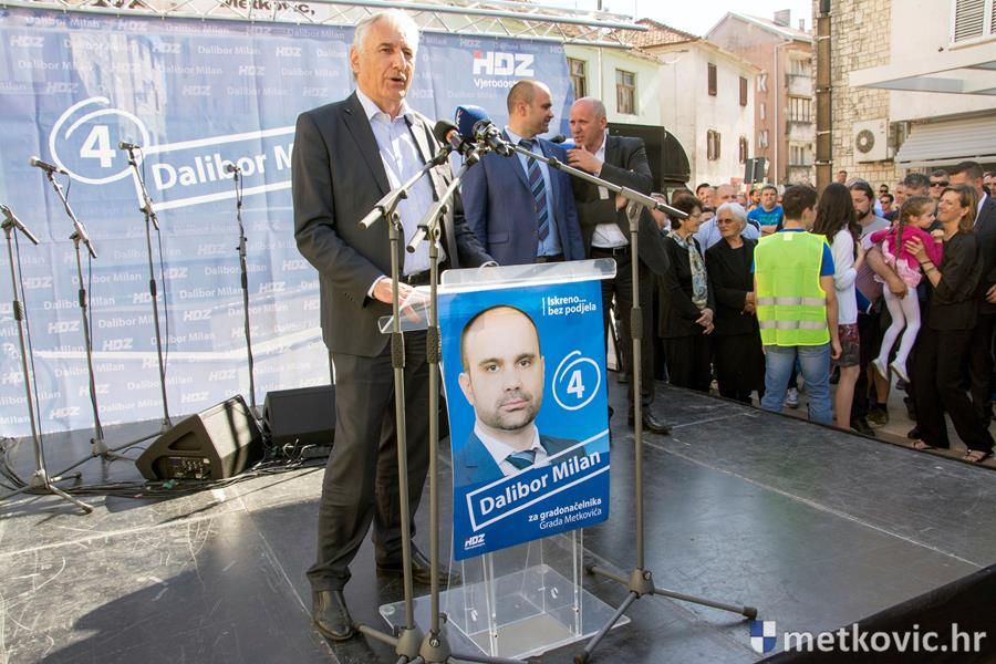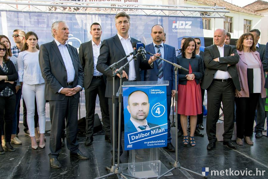 14.5.2017. - Na Trg kralja Tomislava u poslijepodnevnim je satima stigao predsjednik Vlade RH Andrej Plenković, kako bi pružio podršku HDZ-ovu kandidatu za gradonačelnika Metkovića Daliboru Milanu. Uz kandidata Milana i njegov tim, Plenkovića su dočekali i župan Nikola Dobroslavić, europaralmentarka Dubravka Šuica i saborski zastupnik Branko Bačić.