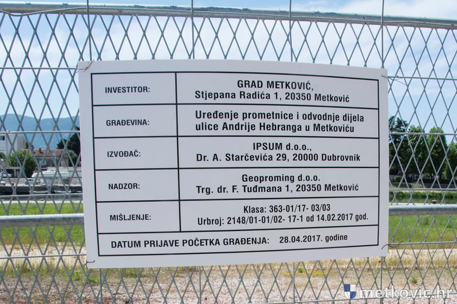 15.5.2017. - Jutros je metkovska gradonačelnica Katarina Ujdur u pratnji svojih suradnika obišla radove u Hebrangovoj ulici, u kojoj će se urediti kolnik s nogostupom i odvodnja dijela te ulice. Riječ je o projektu vrijednom 268.000 kuna, od čega je Ministarstvo graditeljstva i prostornoga uređenja izdvojilo 150.000 kn.