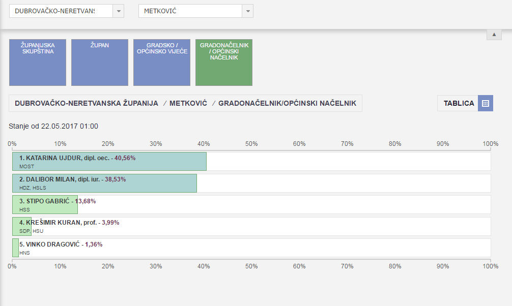 22.5.2017. - Nakon što su uneseni podatci sa svih birališta u Metkoviću je u prvome krugu Katarina Ujdur osvojila 40,56 % glasova, a Dalibor Milan 38,53%. Prema svemu sudeći Most u Gradskome vijeću neće imati većinu jer je vjerojatno da će HSS koalirati s HDZ-om i HSLS-om.