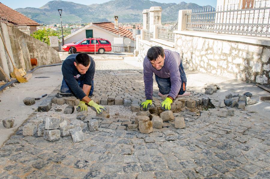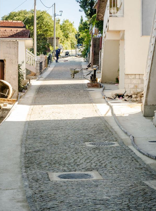 Metković, 10.10.2017. - Jučer su postavljene posljednje granitne kocke na dijelu Lovačkoga puta na kojemu je prije toga postavljena nova vodnokomunalna infrastruktura. Prema planu, slijede radovi u Ulici Vladimira Nazora na dionici od crkve sv. Ilije do raskrižja s Putom kaštela, potom do Verajina guvna i na koncu do Trga kralja Tomislava. Nadamo se da će da će sve ići previđenim tempom, a trebalo bi razmotriti i kako sanirati potporni zid u Nazorovoj na vrhu Skala VI. te dvadesetak metara stare ograde iznad njega.