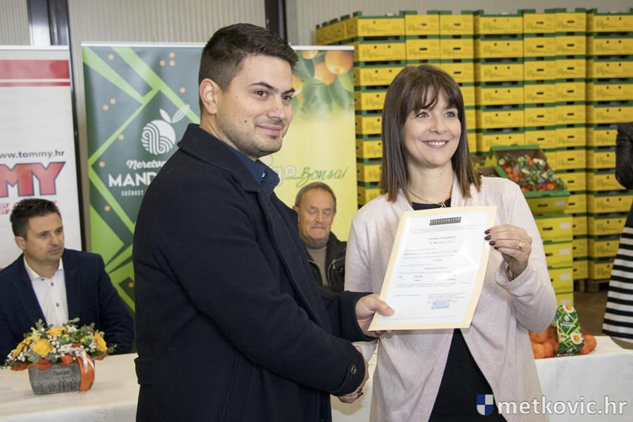Na kraju je Ana Marušić Lisac Tomislavu Ujduru uručila Potvrdu o sukladnosti kojom se potvrđuje da Frigo bonsai proizvodi poljoprivredni proizvod s oznakom izvornosti i koji se na tržište stavlja pod nazivom Neretvanska mandarina, na što je suosnivač tvrtke Frigo bonsai Nikola Ujdur rekao da je neretvanska mandarina do sada imala ime, a od sada ima i prezime.