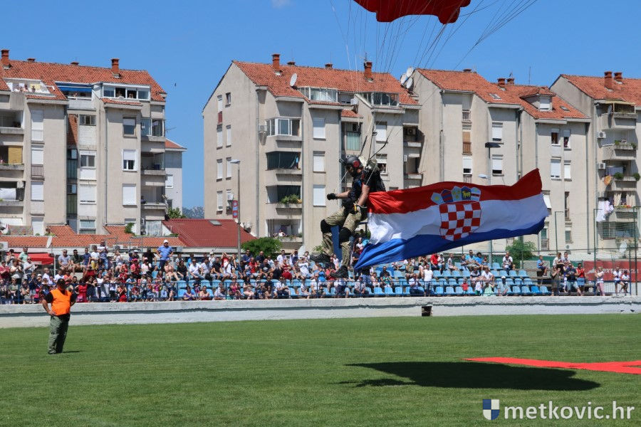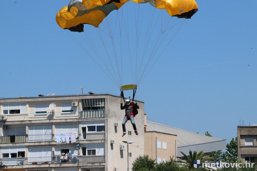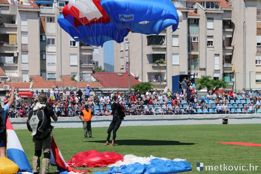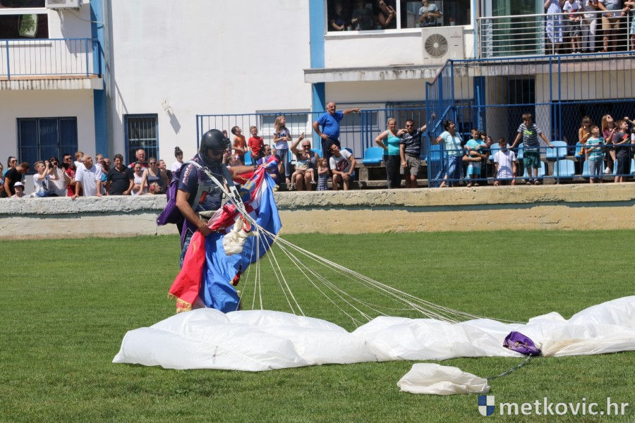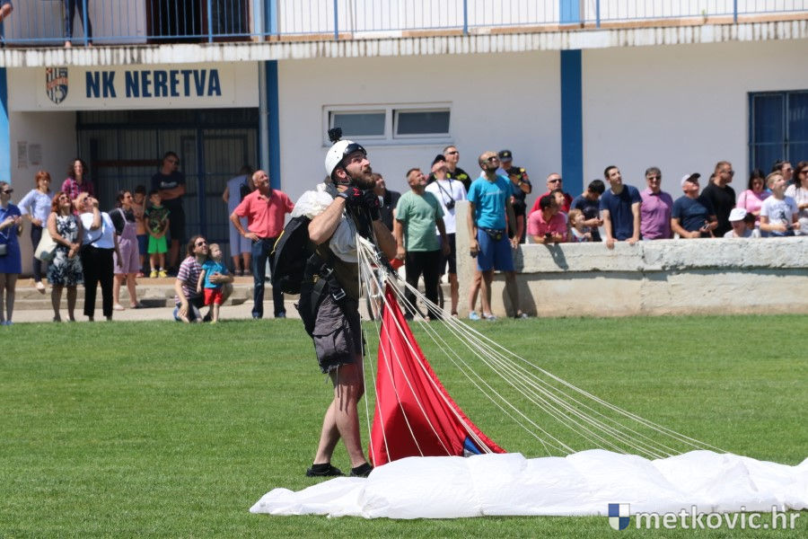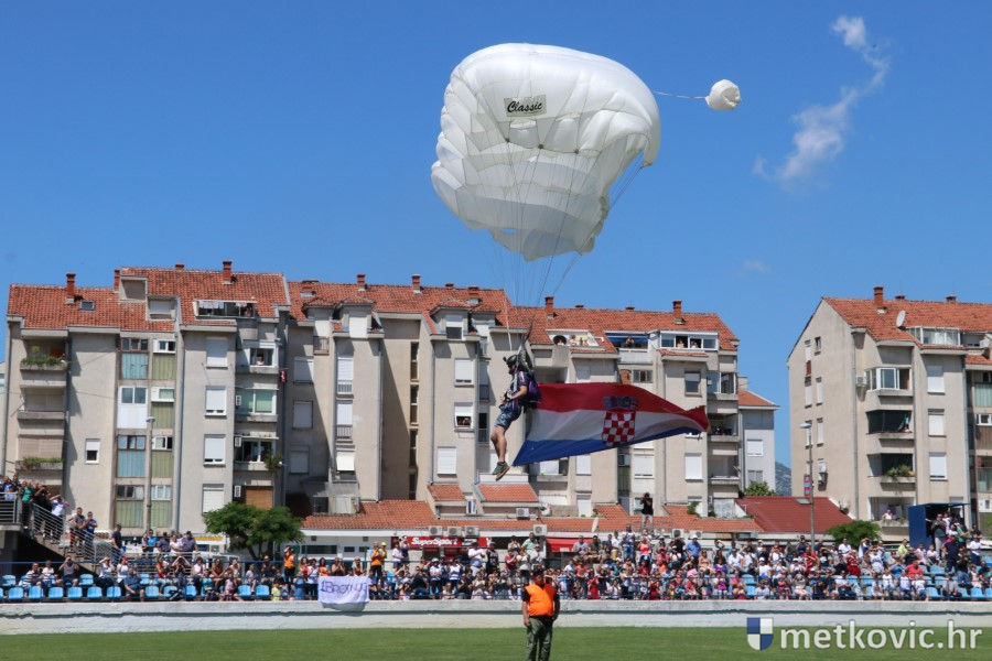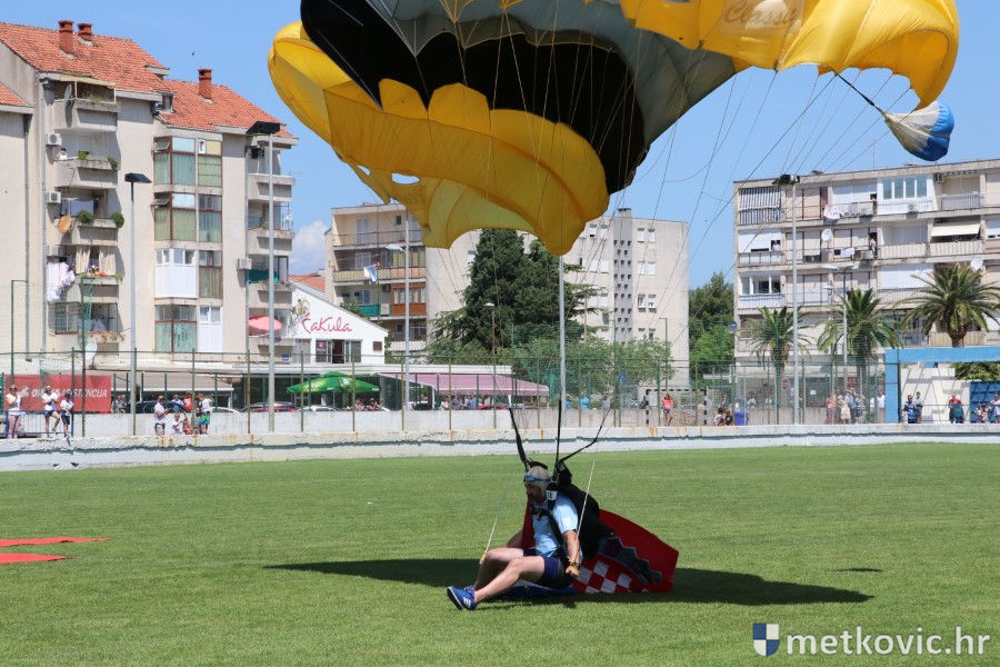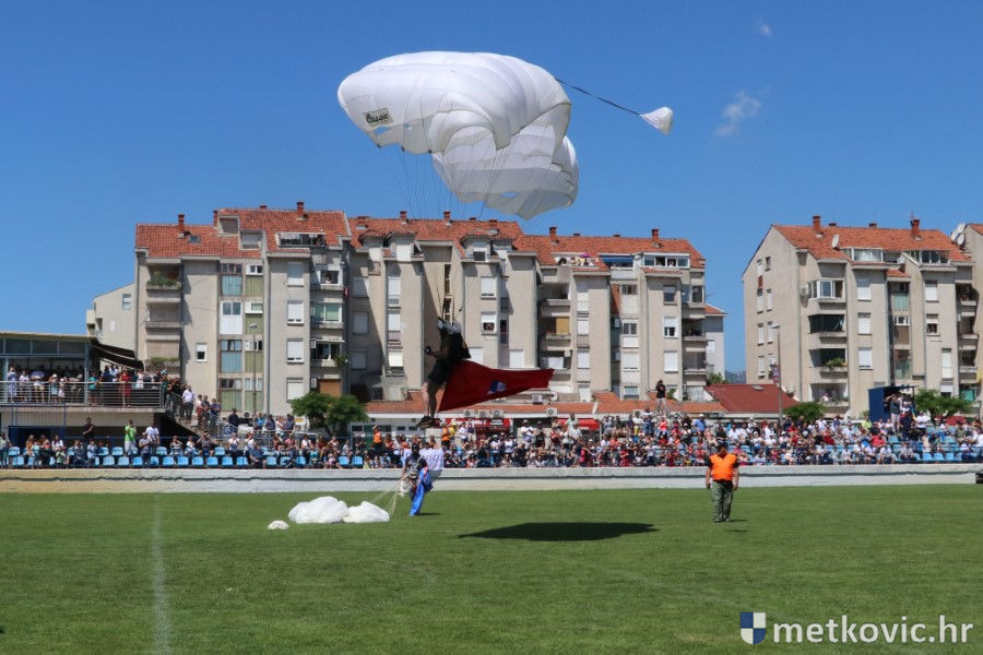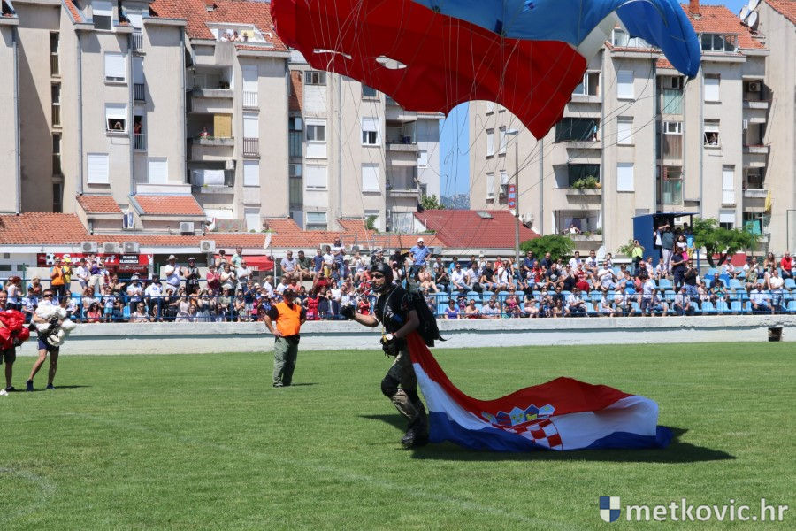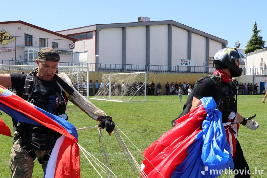 Svečani mimohod sudionika proslave krenuo je s Trga ka Igralištu Iza Vage, na kojemu je desetorica padobranaca iz Aerokluba Sinj izvela atraktivne skokove sa zastavama Republike Hrvatske, gradova Metkovića i Sinja te Udruge veterana IV. gbr. Poslije skokova građani su na pomoćnome nogometnom igralištu mogli razgledati helikopter HRZ-a MI-8, iz kojega su padobranci bili skakali. Naravno, najviše su se tome radovala djeca.