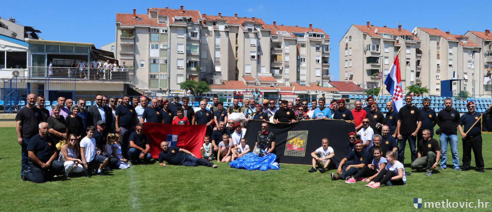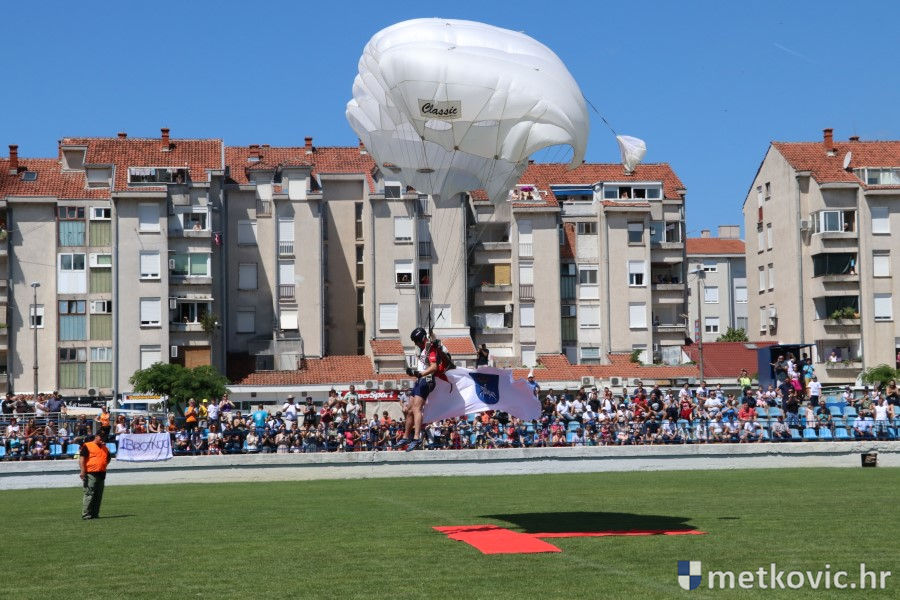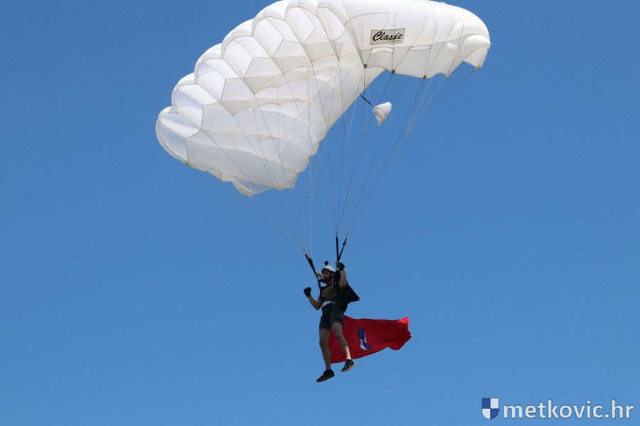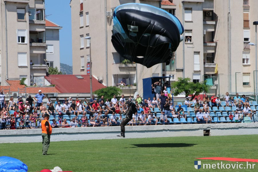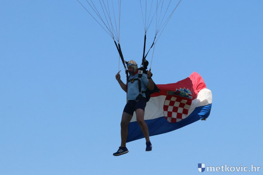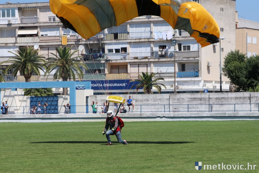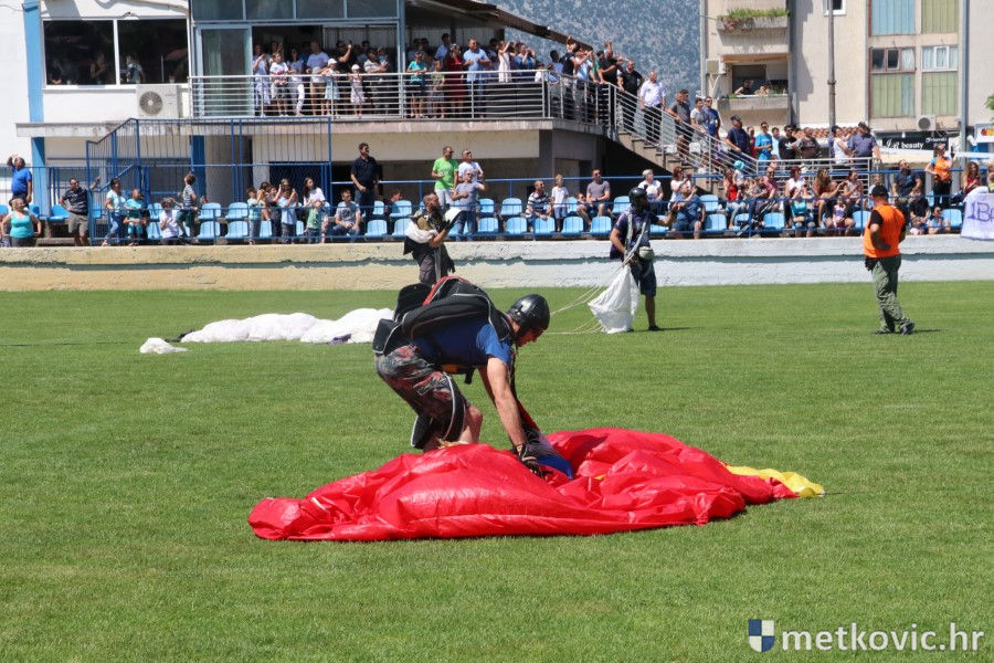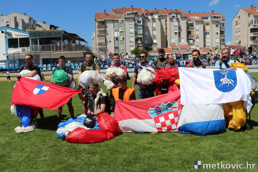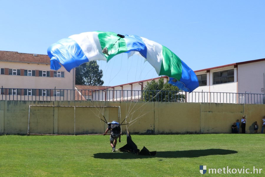 Svečani mimohod sudionika proslave krenuo je s Trga ka Igralištu Iza Vage, na kojemu je desetorica padobranaca iz Aerokluba Sinj izvela atraktivne skokove sa zastavama Republike Hrvatske, gradova Metkovića i Sinja te Udruge veterana IV. gbr. Poslije skokova građani su na pomoćnome nogometnom igralištu mogli razgledati helikopter HRZ-a MI-8, iz kojega su padobranci bili skakali. Naravno, najviše su se tome radovala djeca.