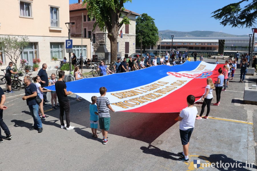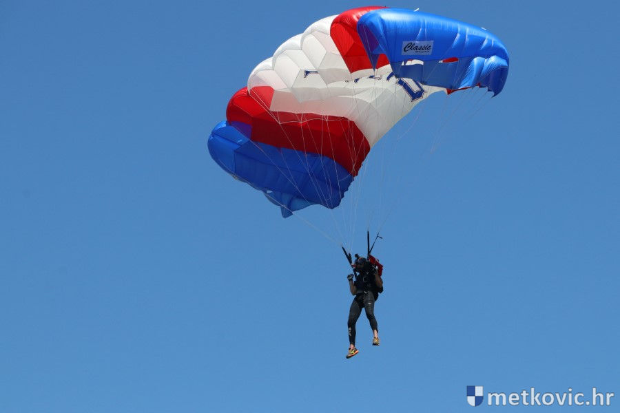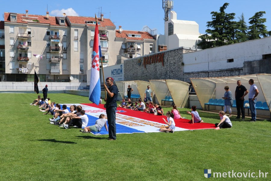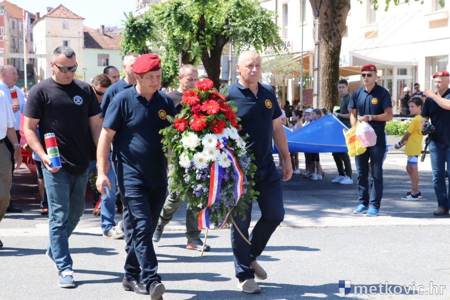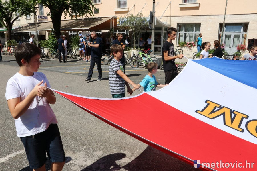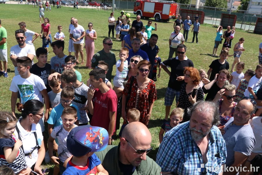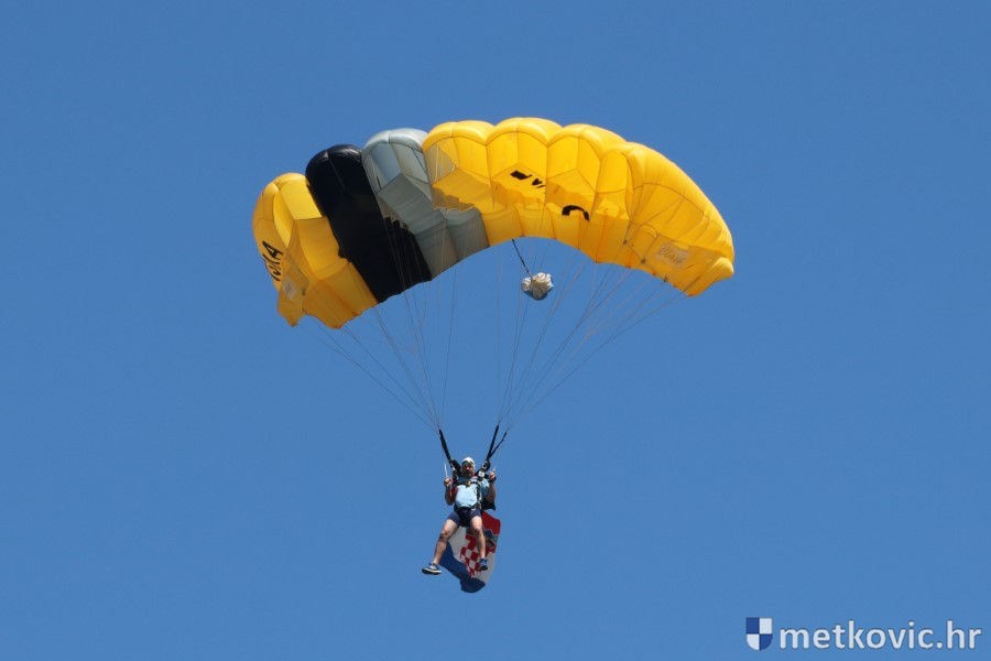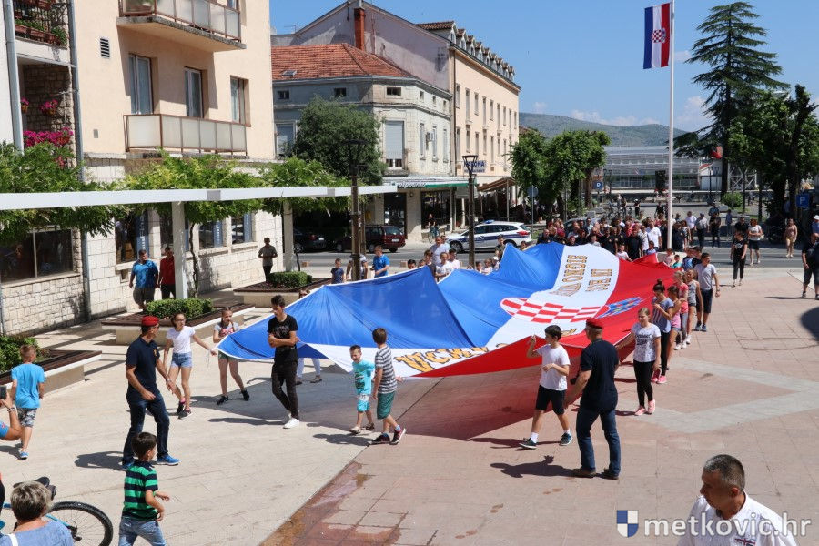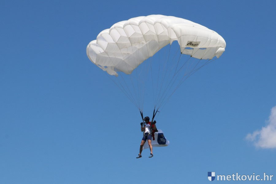 Svečani mimohod sudionika proslave krenuo je s Trga ka Igralištu Iza Vage, na kojemu je desetorica padobranaca iz Aerokluba Sinj izvela atraktivne skokove sa zastavama Republike Hrvatske, gradova Metkovića i Sinja te Udruge veterana IV. gbr. Poslije skokova građani su na pomoćnome nogometnom igralištu mogli razgledati helikopter HRZ-a MI-8, iz kojega su padobranci bili skakali. Naravno, najviše su se tome radovala djeca.
