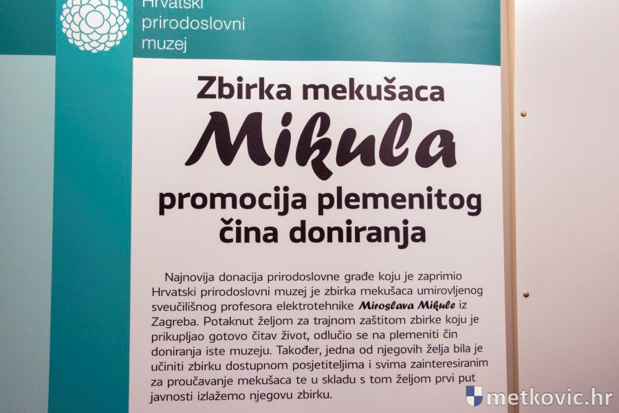 22.7.2018. - Gostujuća izložba Hrvatskoga prirodoslovnoga muzeja, koju svakako preporučujemo pogledati, otvorena je 17. srpnja u Prirodoslovnome muzeju Metković. Riječ je o vrijednoj donaciji ljuštura mekušaca, koje je HPM-u darovao umirovljeni sveučilišni profesor Miroslav Mikula, koji je tijekom 70 godina prikupio 5775 primjeraka ljuštura, raspoređenih u 565 vrsta.