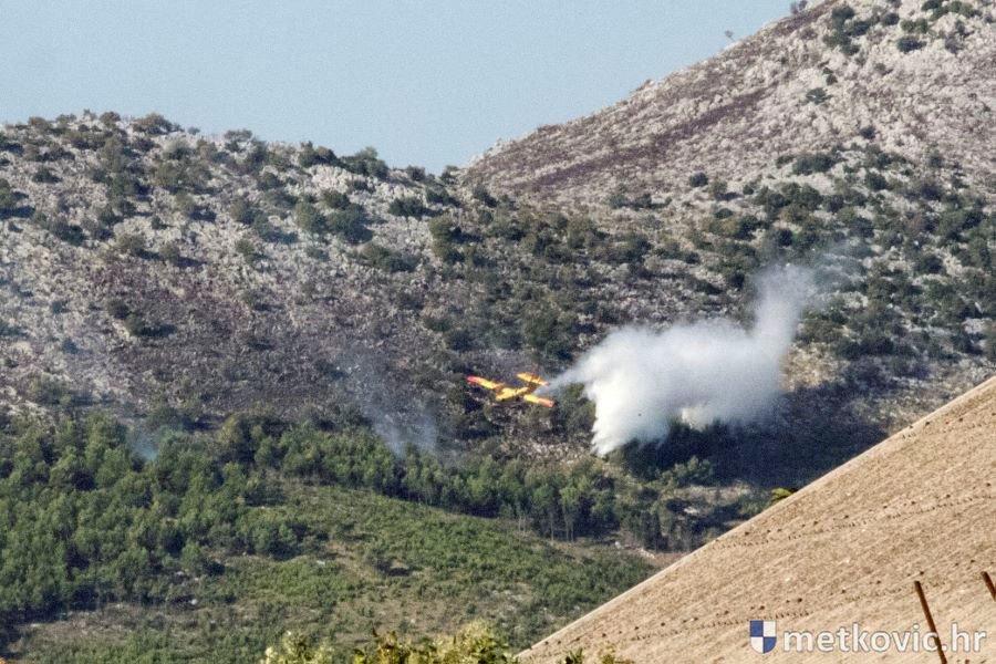 Metković, 26.9.2018. - Unatoč jakoj buri, trenutno na požarištu iznad Matijevića djeluju dva kanadera i to uspješno. Nadajmo se najboljemu.