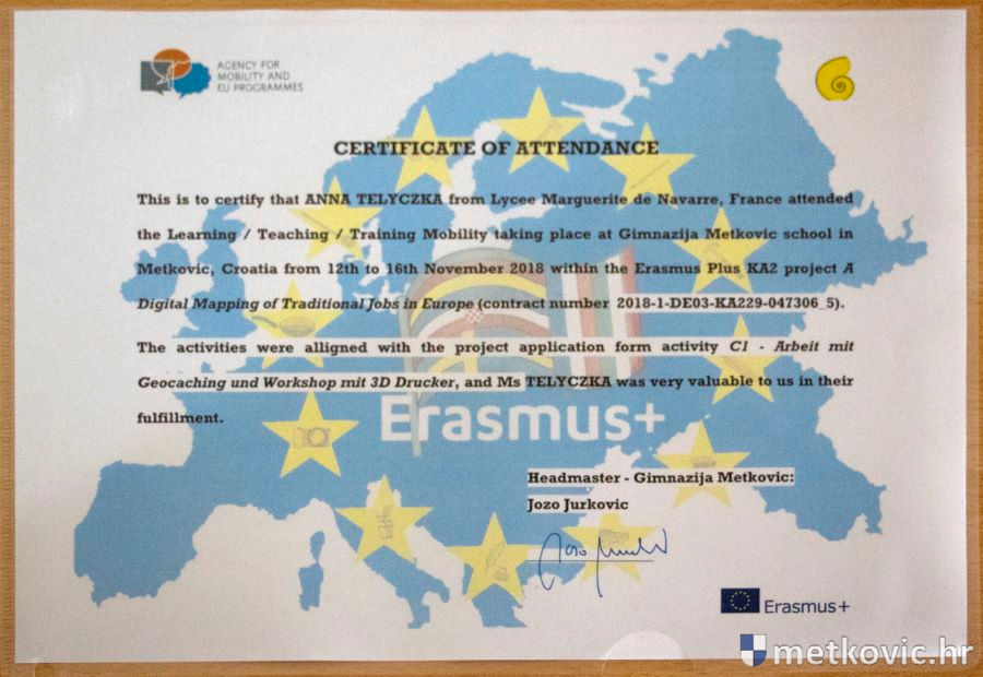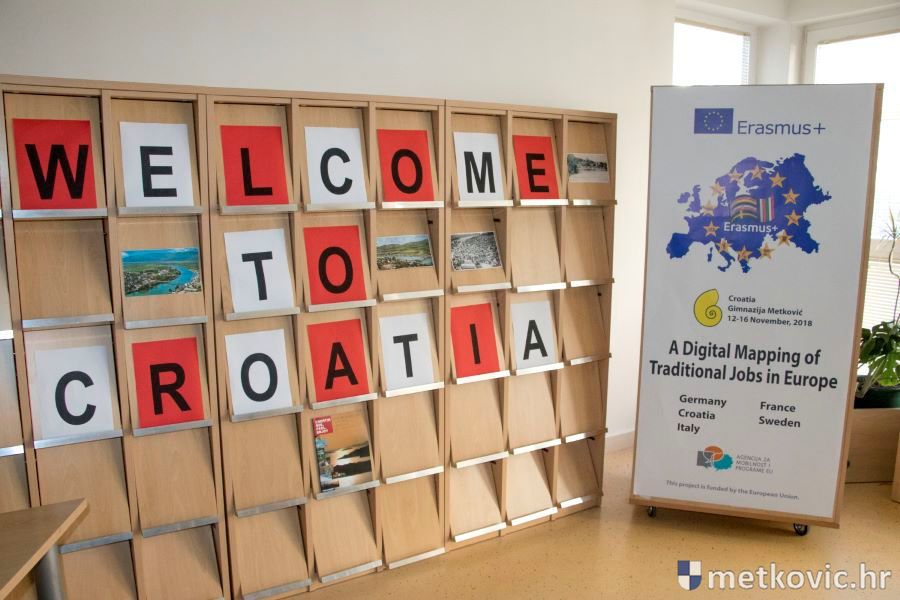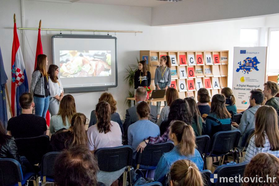 15.11.2018. - Gimnazija Metković ugostila je 26 učenika i desetero njihovih profesora iz Njemačke, Francuske, Italije i Švedske, koji s našima sudjeluju u Projektu 'Digital Mapping of Traditional Jobs in Europe', što se provodi u sklopu Programa 'Erasmus+'.