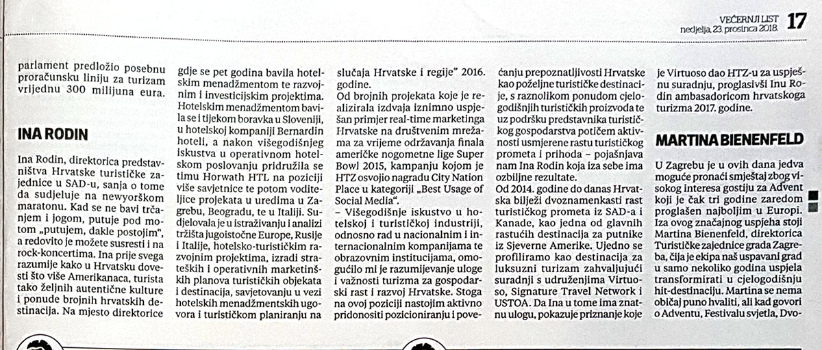 Metković, 23.12.2018. - Današnji Večernji list donosi veliki članak o pet žena koje su pokrenule nove trendove u hrvatskom turizmu. Među njima je i Ina Rodin, direktorica predstavništva Hrvatske turističke zajednice u SAD-u.