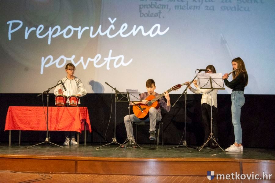 Program je započeo pjesmama Tamo gdje palme cvatu i Krist na žalu, koje je pod ravnanjem Dragana Gutića otpjevao Zbor Osnovne glazbene škole Metković. Glazbenu pratnju pružili su Matea Jurilj i Mateo Obrvan. Darko Tot je uz klavirsku pratnju Romea Hercega na saksofonu svirao Matanovićev Rondo rustico, a potom je skupina učenika OGŠ Metković izvela peruansku Pjesmu frule. Nastupili su: Ana Sušak, Željka Jerković, Petar Bubalo i Ana Kiridžija. Učenike OGŠ Metković pripremili su njihovi mentori Erna Rebić, Mihaela Pavlović i Željko Mandarić.