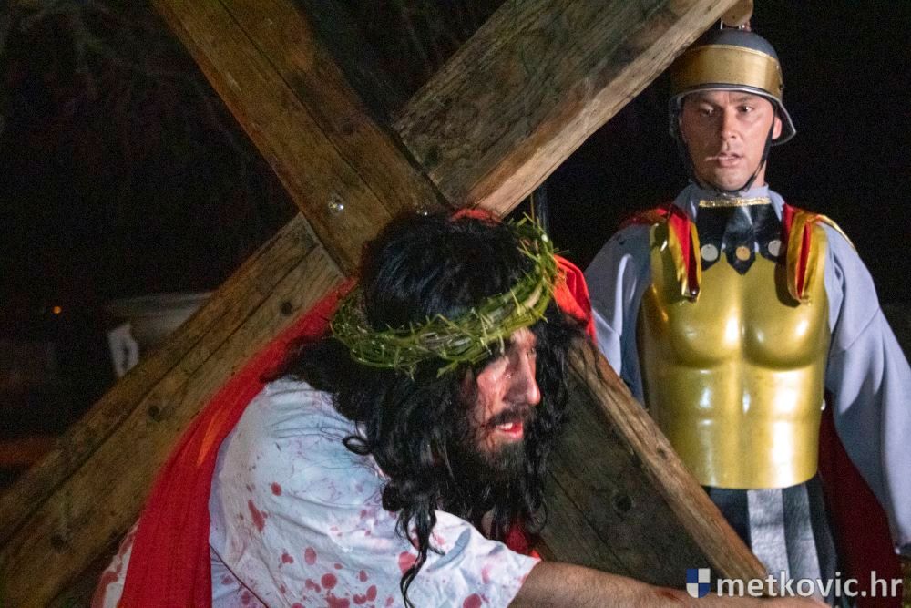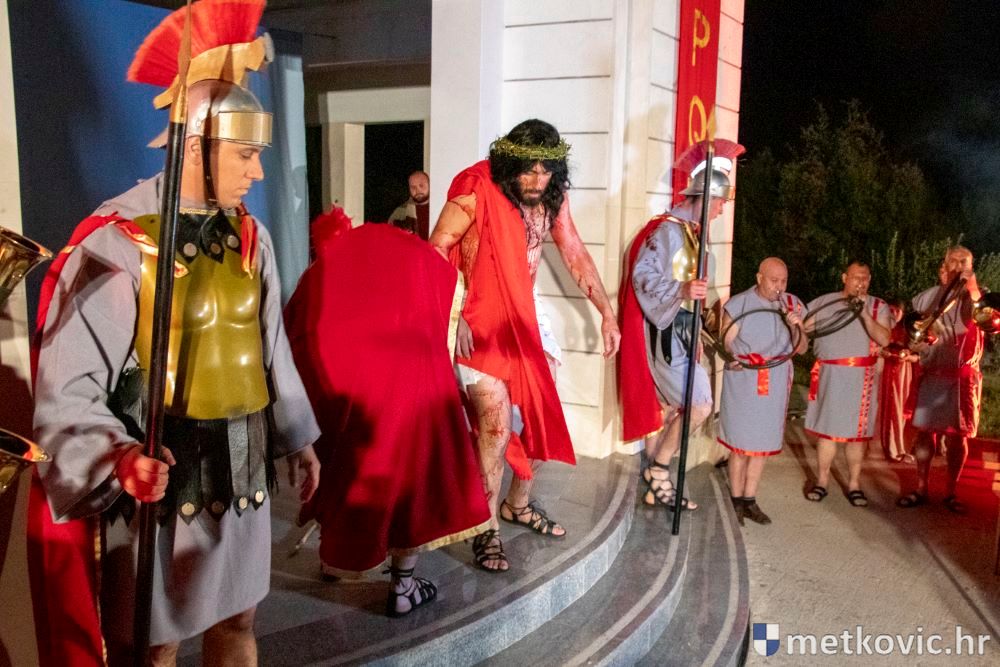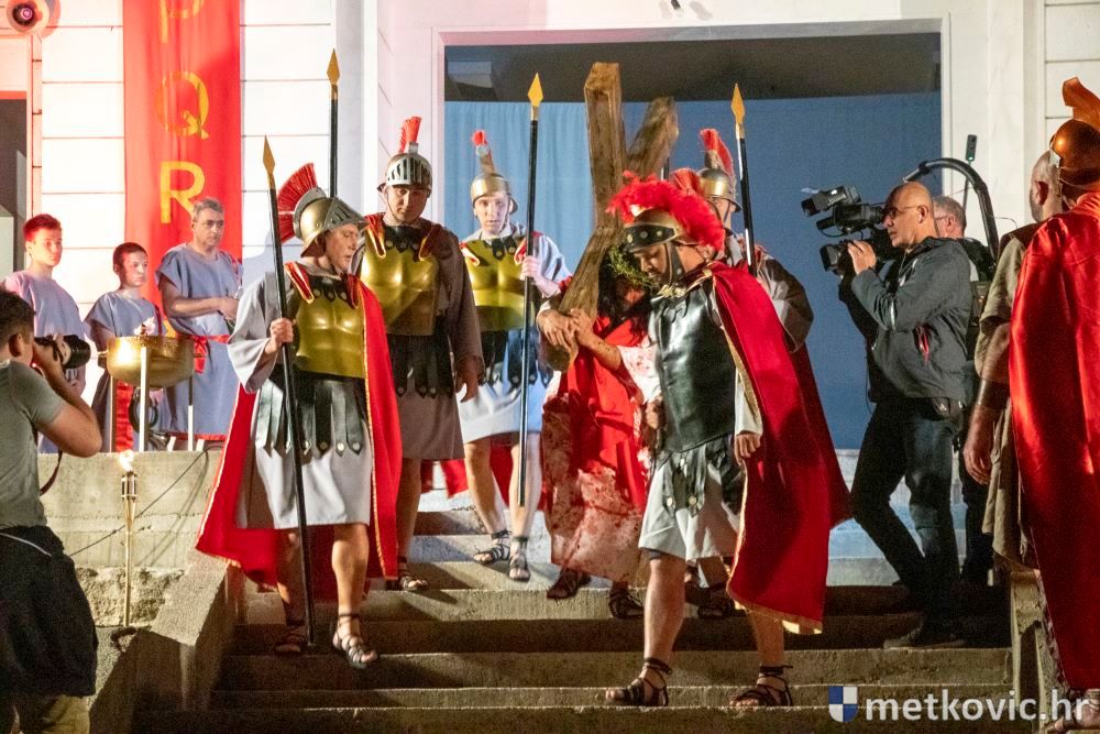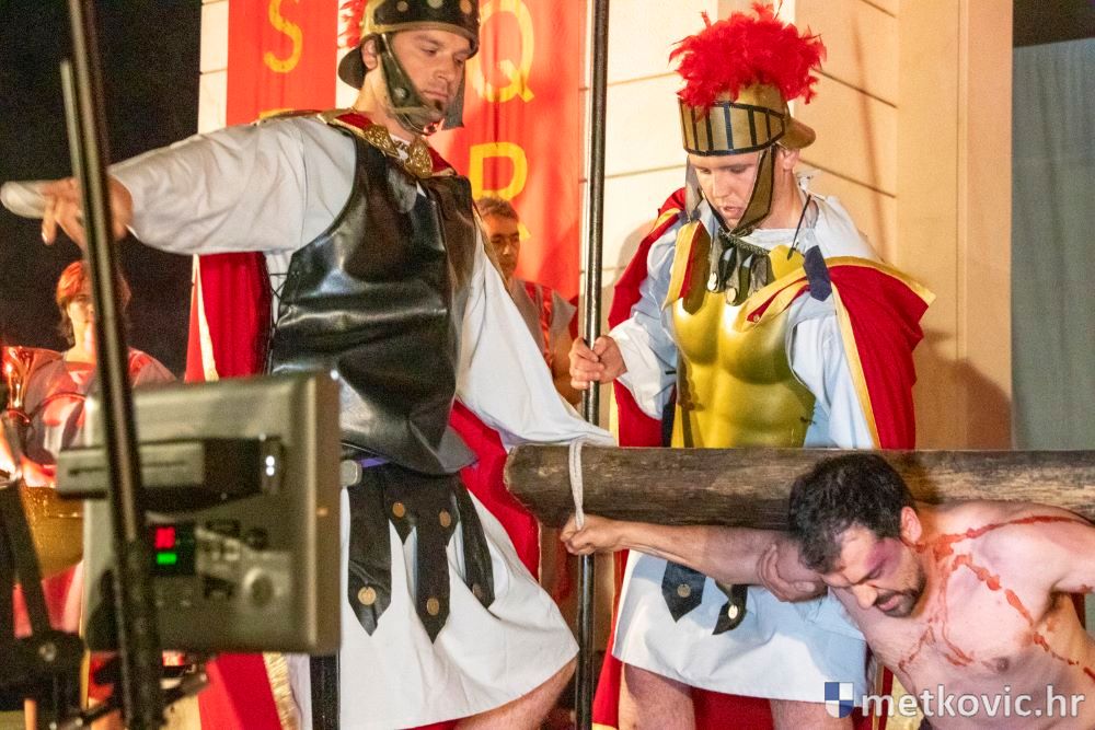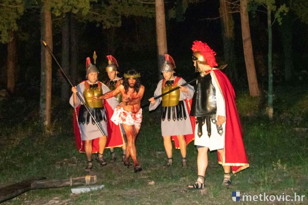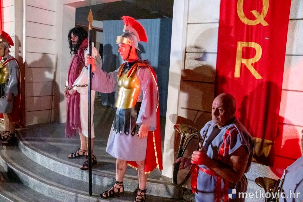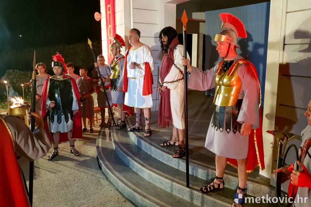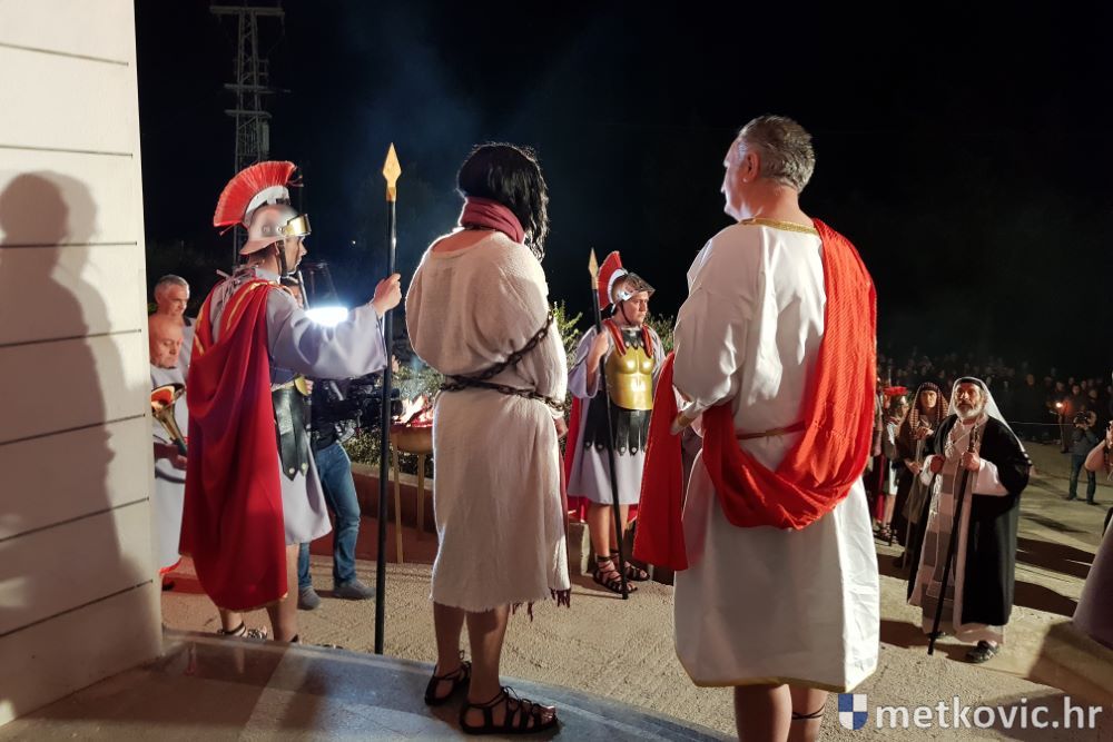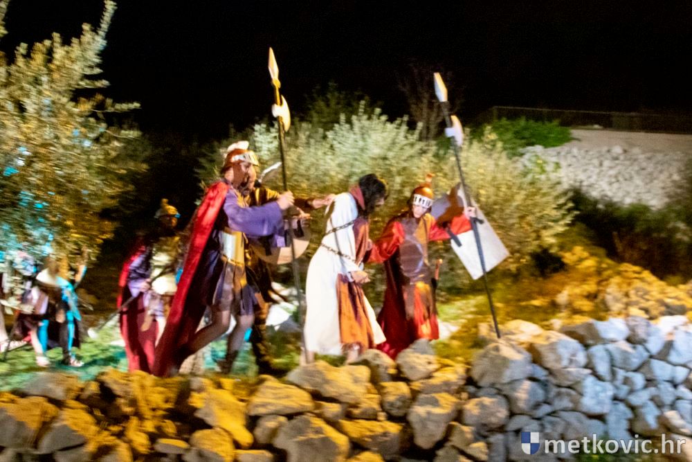 Riječ je o predstavi u kojoj je u režiji Branka Medaka sudjelovalo više od stotinu glumaca amatera i statista te žudije i Zbor Župe sv. Nikole. Isusa Krista tumačio je Marko Jerković, njegovu majku Anđela Brečić, Veroniku Maja Jerković, Poncija Pilata Ivan Menalo, Kajfu Nikola Primorac, velikoga svećenika Anu Tihomir Bandur te Petra i Judu Martin Medak i Igor Ivanković itd.