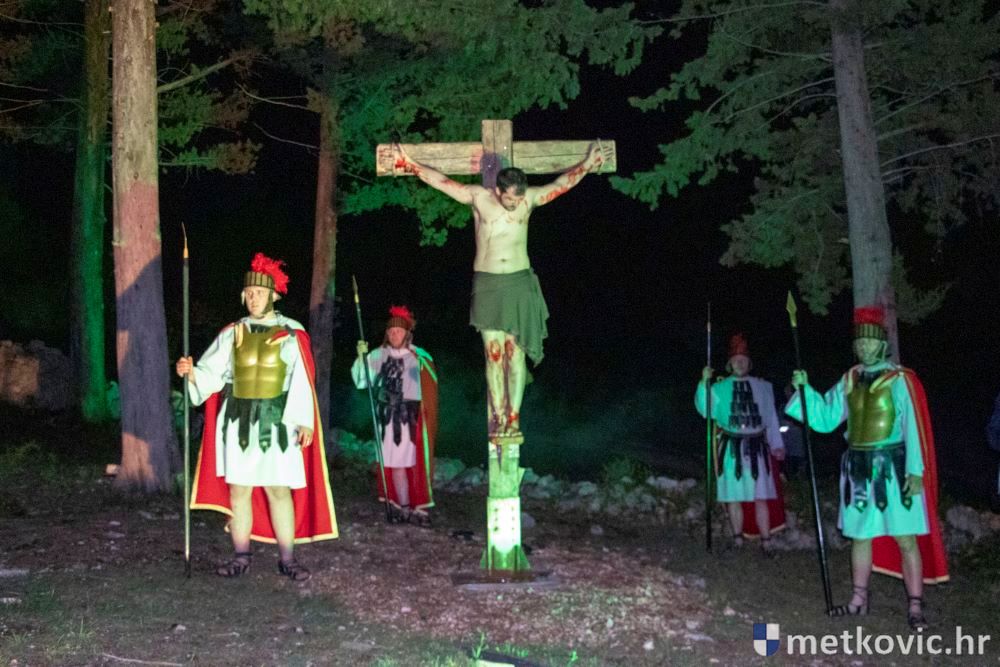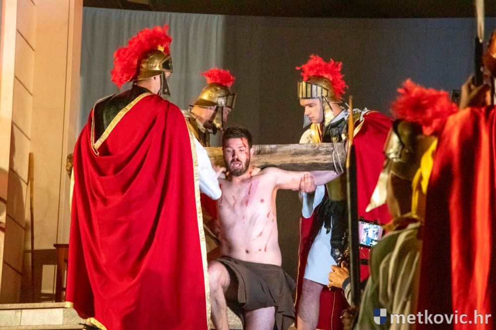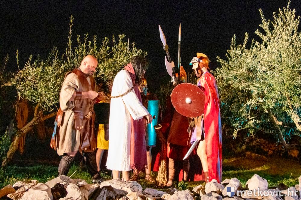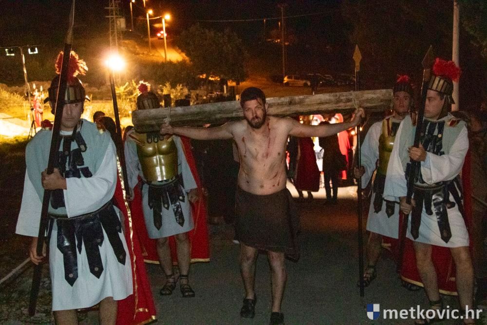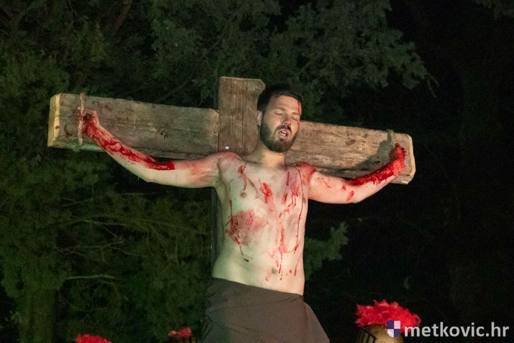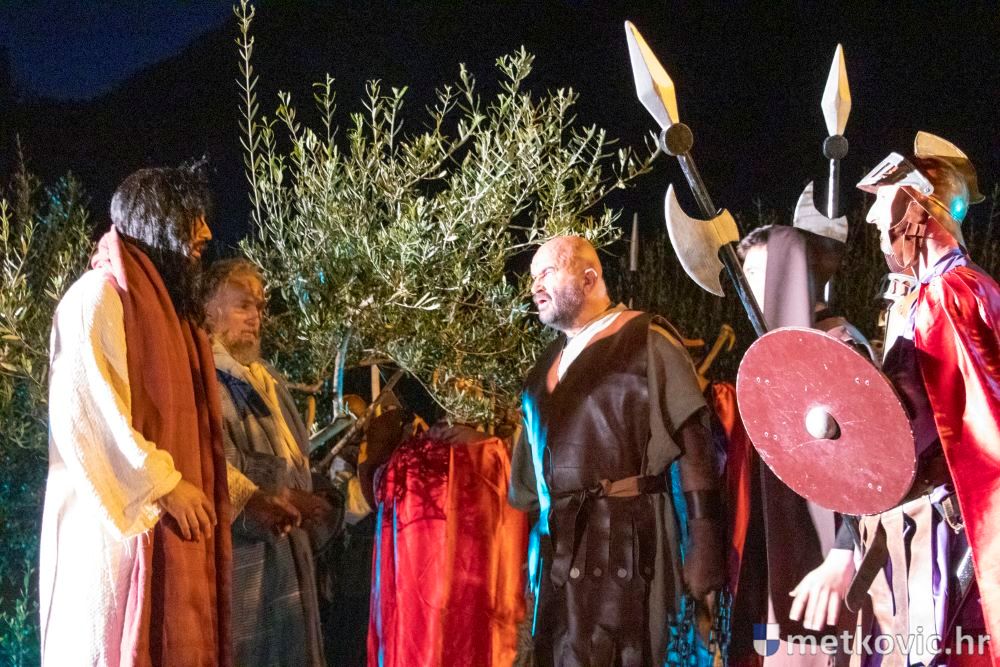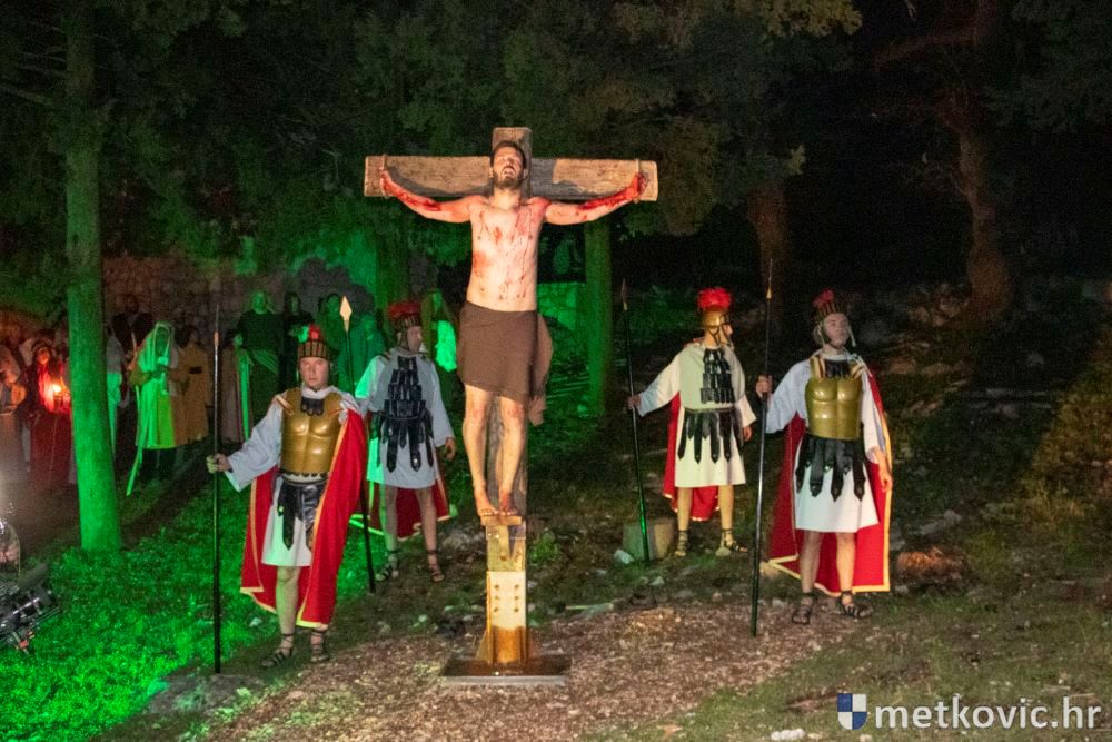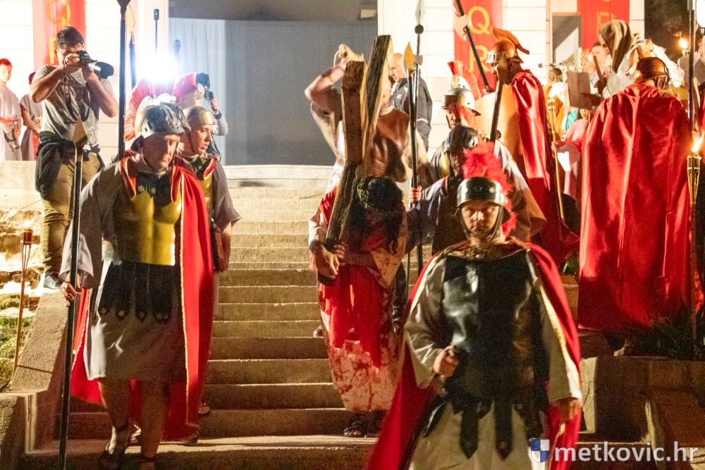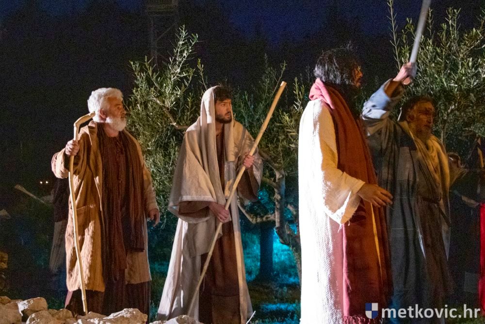 Riječ je o predstavi u kojoj je u režiji Branka Medaka sudjelovalo više od stotinu glumaca amatera i statista te žudije i Zbor Župe sv. Nikole. Isusa Krista tumačio je Marko Jerković, njegovu majku Anđela Brečić, Veroniku Maja Jerković, Poncija Pilata Ivan Menalo, Kajfu Nikola Primorac, velikoga svećenika Anu Tihomir Bandur te Petra i Judu Martin Medak i Igor Ivanković itd.