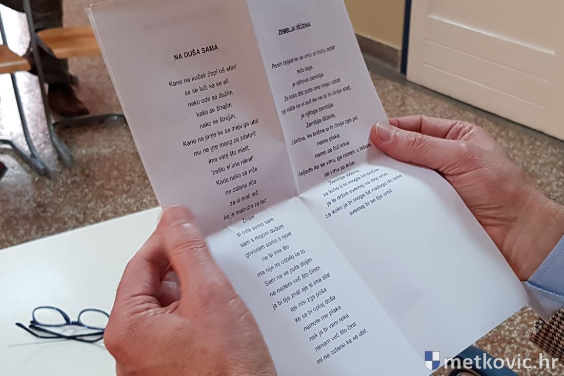 Književnik i pjesnik Mile Pešorda govorio je o sustavnom ignoriranju djelovanja humsko-hercegovačkih književnika i pjesnika. Za primjer je uzeo svoju knjigu Sloboda, mir meju nami – Eurogledi, za koju je rekao da ju je nemoguće naći u knjižarama ili knjižnicama. Spomenuo se još jednoga pjesnika s hercegovačkoga područja. To je pok. Nikola Martić, rođenjem Višićanin, koji je također bio vezan uz Metković. Pešorda je pročitao predgovor spomenutoj knjizi, koji je naslovio s Posveta… svima koji ljube Istinu i sviet…, posvećen istini o stvaranju Hrvatske i o Domovinskome ratu. Na istu tematiku nadovezala se Anita Martinac, hrvatska braniteljica i sudionica operacija Ljeto 95. i Oluja, što je oblikovalo njezino književno djelovanje. Ona je čitala pjesme iz svoje zbirke Budna.