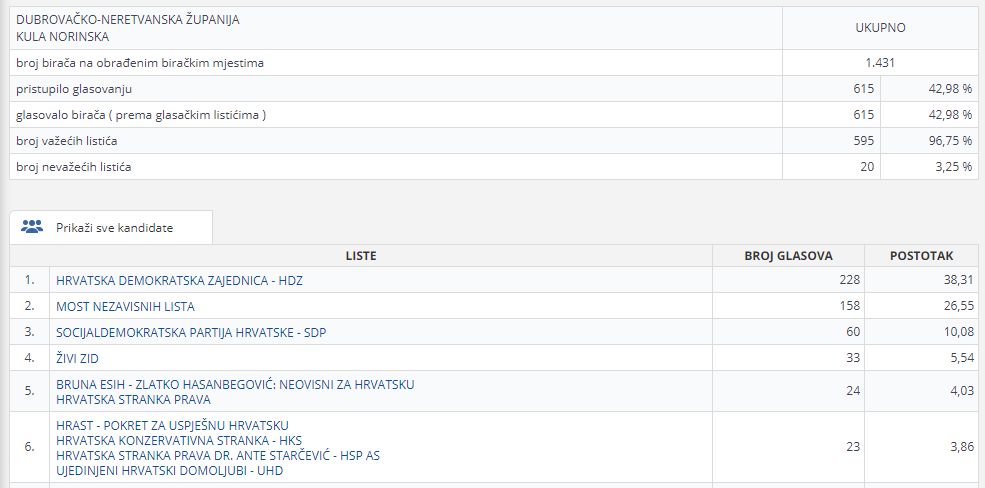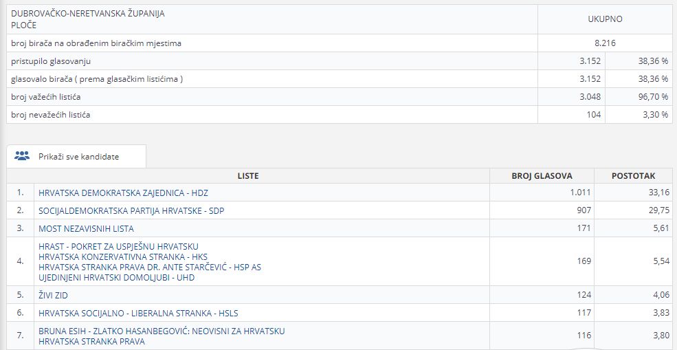 Evo i rezultara u Dubrovačko-neretvanskoj županiji te u šest ostalih neretvanskih gradova i općina: DUBROVAČKO-NERETVANSKA ŽUPANIJA  Evo i kandidata koji su dobili najveći broj preferencijskih glasova u Dubrovačko-neretvanskoj županiji: 1. | DUBRAVKA ŠUICA | 4.054 | 34,90 | 2. | RUŽA TOMAŠIĆ | 2.602 | 80,23 | 3. | TONINO PICULA | 1.850 | 32,76 | 4. | BOŽO PETROV | 1.775 | 47,74 | 5. | KARLO RESSLER | 1.523 | 13,11 | 6. | MISLAV KOLAKUŠIĆ | 1.359 | 81,71 | 7. | BILJANA BORZAN | 1.229 | 21,76 | 8. | MARIJANA PETIR | 701 | 82,86 | 9. | BRUNA ESIH | 572 | 44,68 | 10. | IVAN VILIBOR SINČIĆ | 338 | 24,31 |