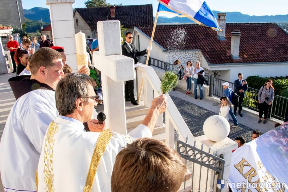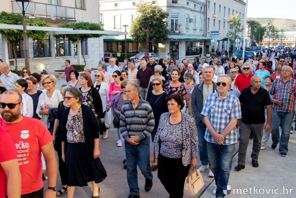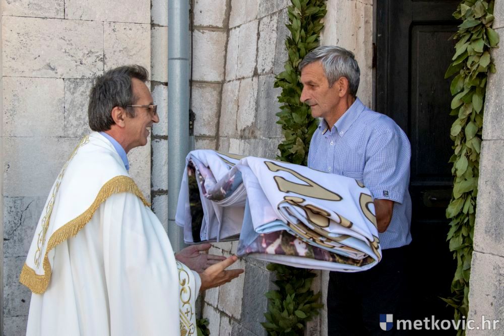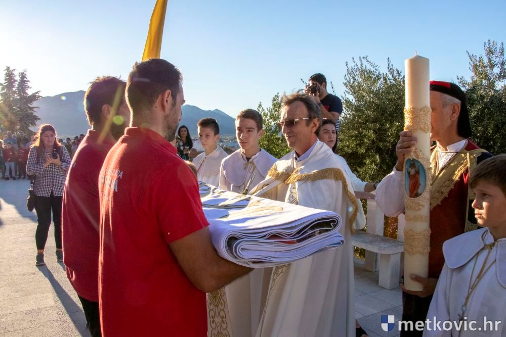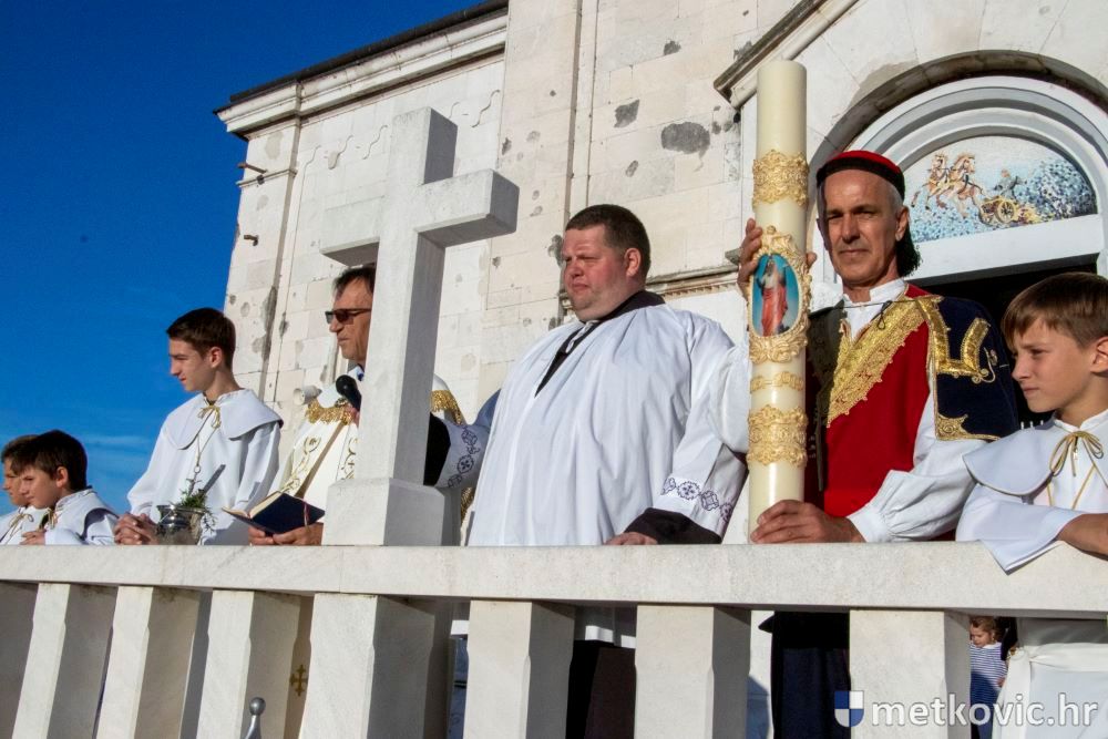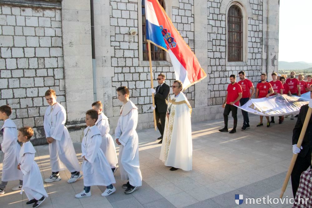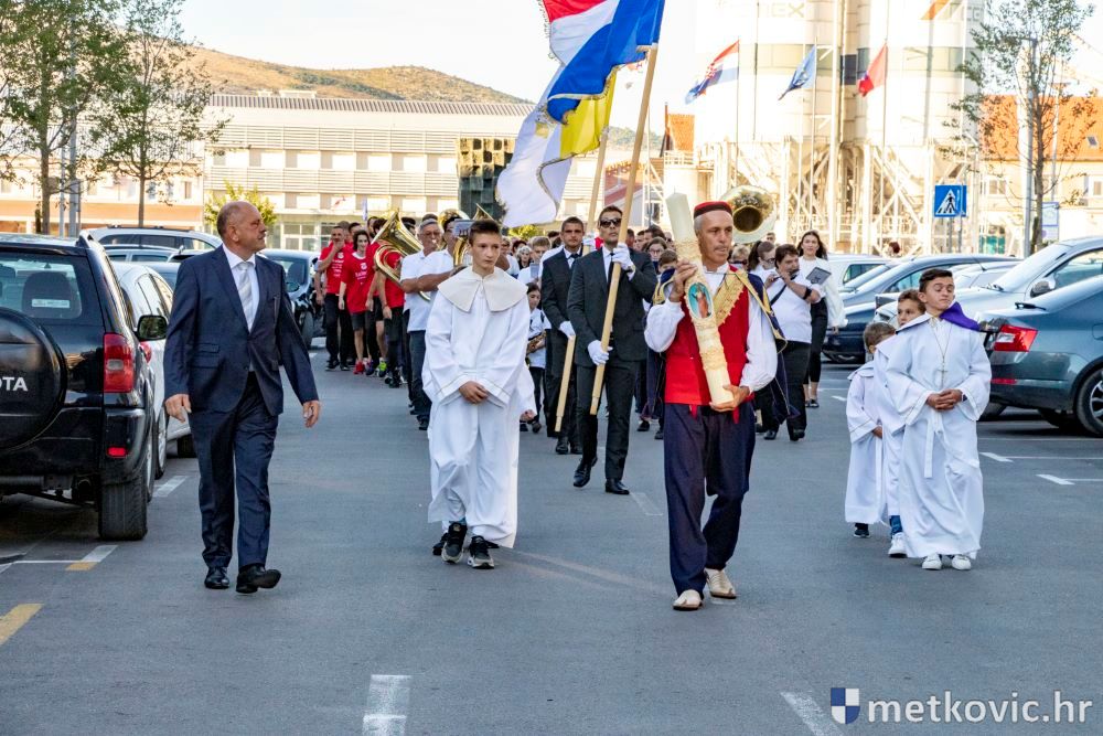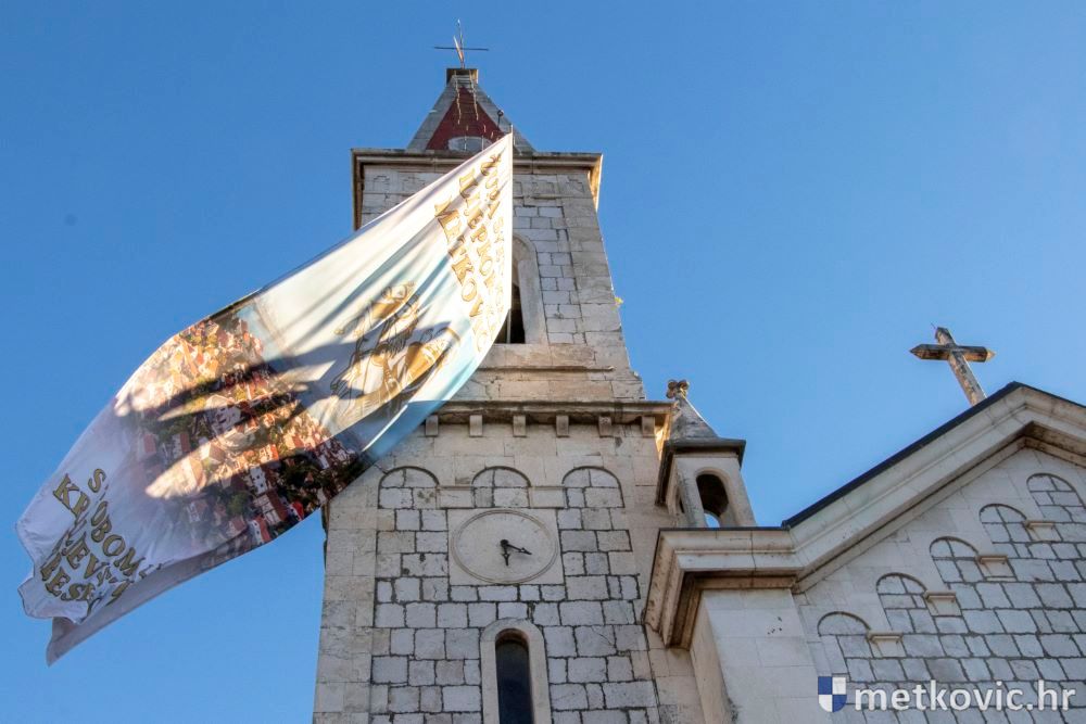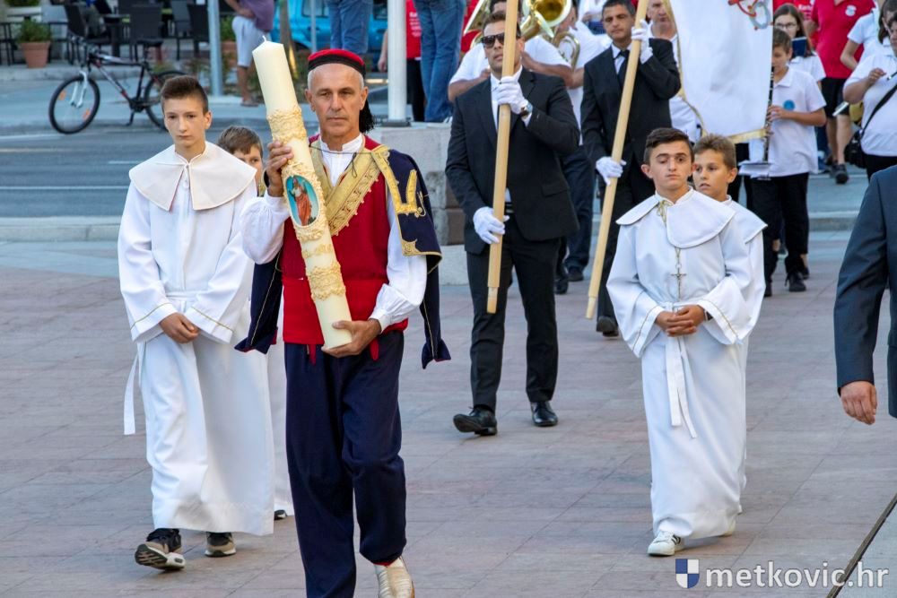 Praćeni građanima i Gradskom glazbom Metković potom su u mimohodu krenuli preko Trga i Ulicom Vladimira Nazora do župne crkve, pred kojom ih je čekao župnik fra Ante Bilokapić, koji je blagoslovio svijeću i zastavu. Zastava je nakon prigodne ceremonije izvješena na crkvenome zvoniku, a svijeća svečano unesena u crkvu. Potom je započelo misno slavlje, što ga je u suslavlju sa župnikom i župnim kapelanom fra Darijom Sinkovićem predvodio fra Šimun Bilokapić.
