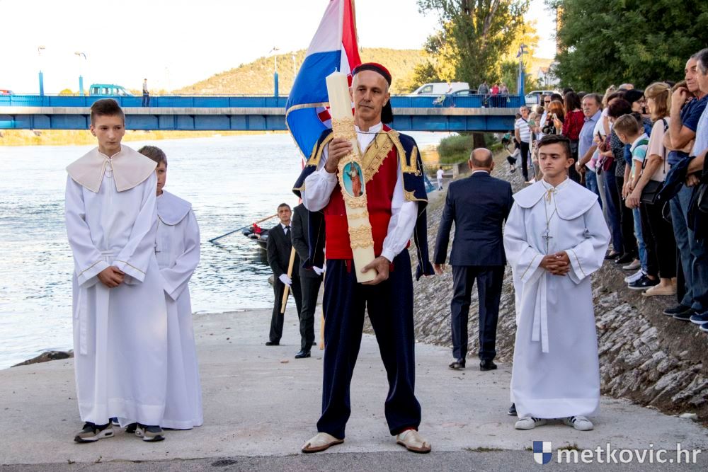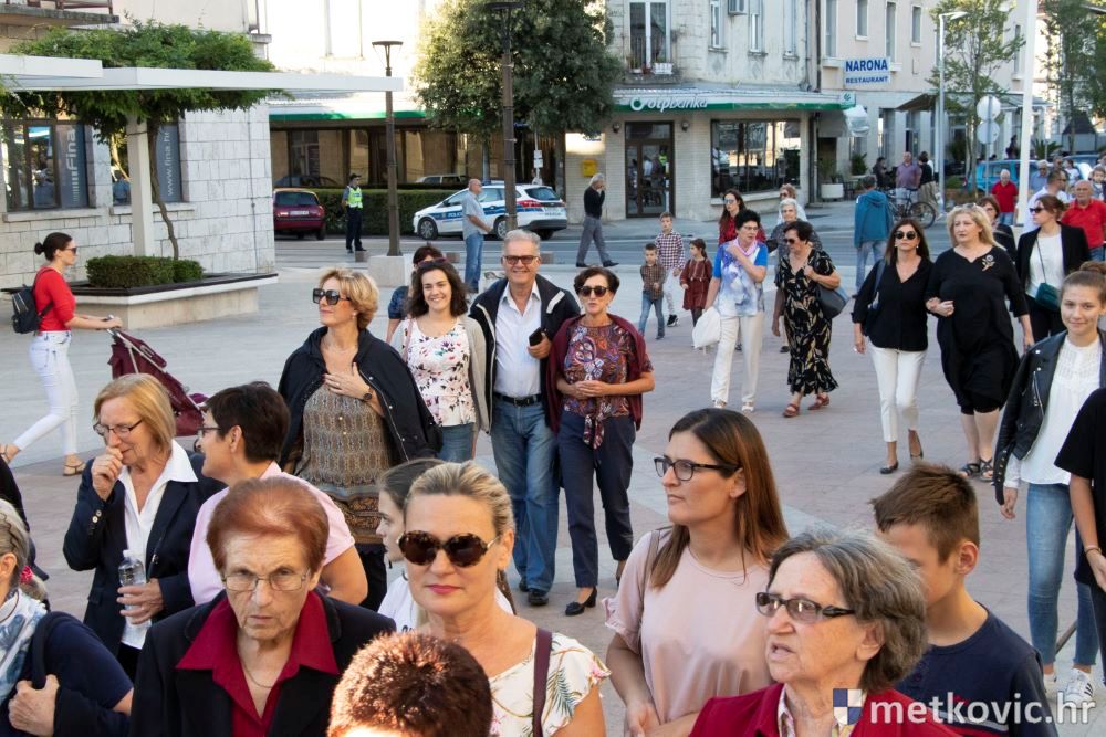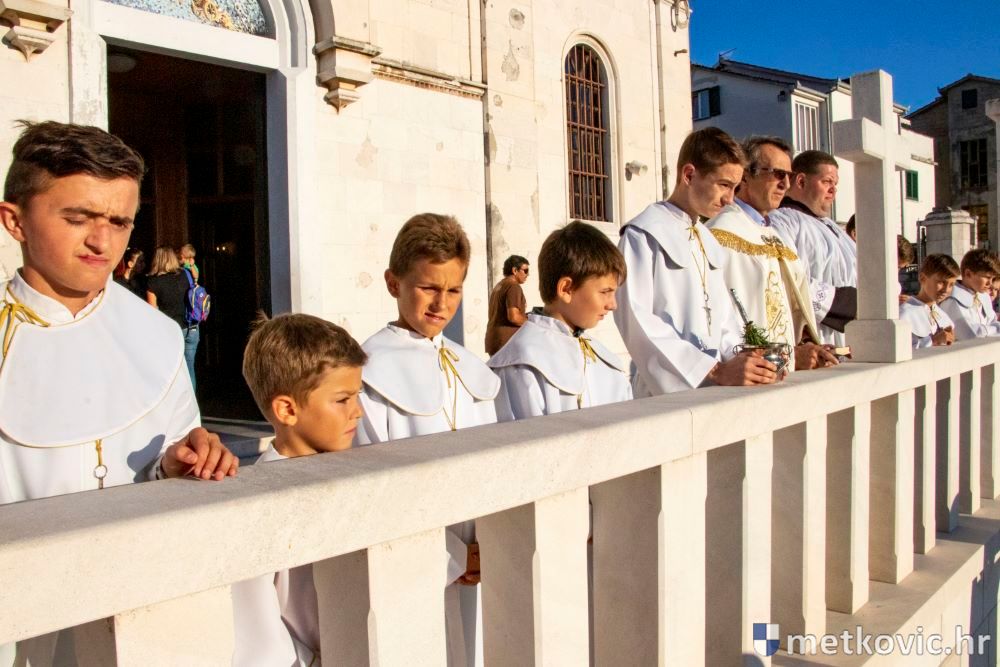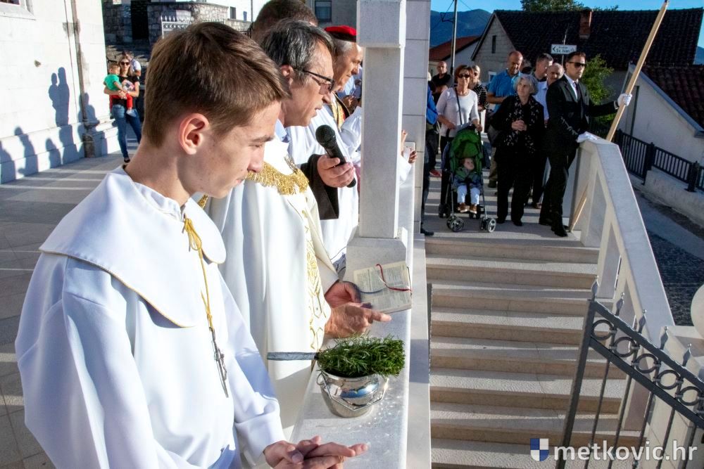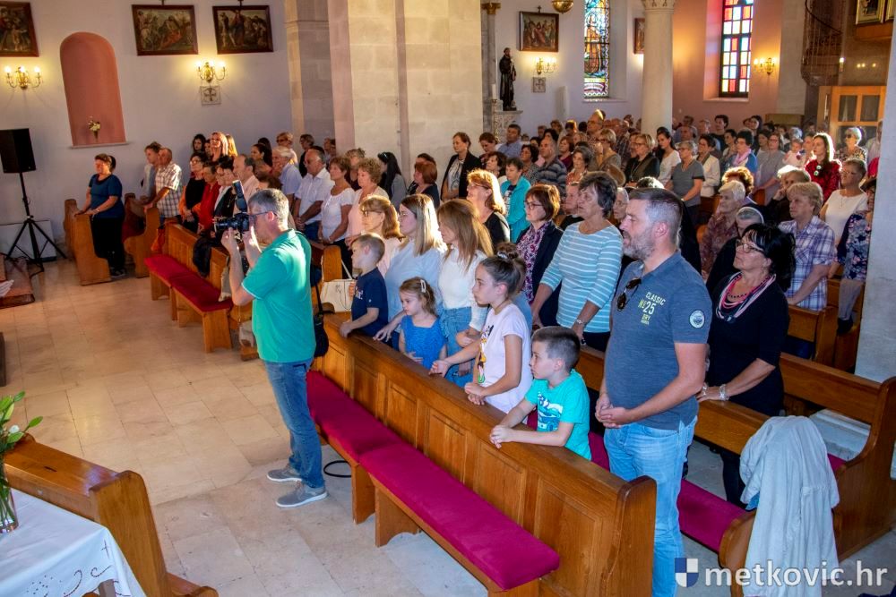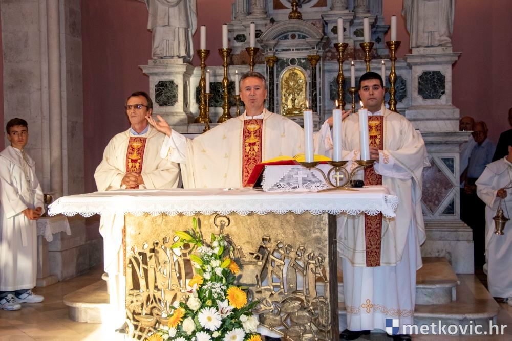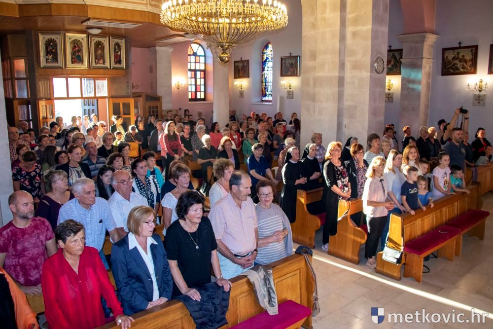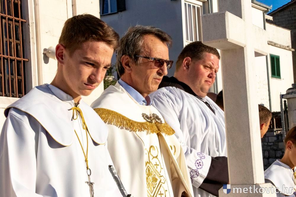 Praćeni građanima i Gradskom glazbom Metković potom su u mimohodu krenuli preko Trga i Ulicom Vladimira Nazora do župne crkve, pred kojom ih je čekao župnik fra Ante Bilokapić, koji je blagoslovio svijeću i zastavu. Zastava je nakon prigodne ceremonije izvješena na crkvenome zvoniku, a svijeća svečano unesena u crkvu. Potom je započelo misno slavlje, što ga je u suslavlju sa župnikom i župnim kapelanom fra Darijom Sinkovićem predvodio fra Šimun Bilokapić.