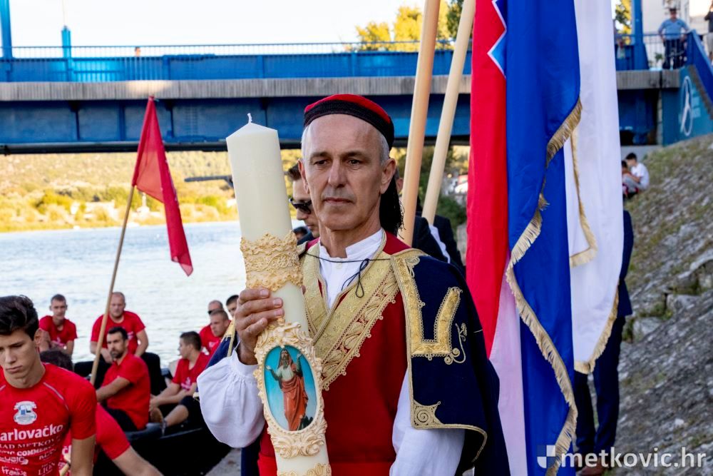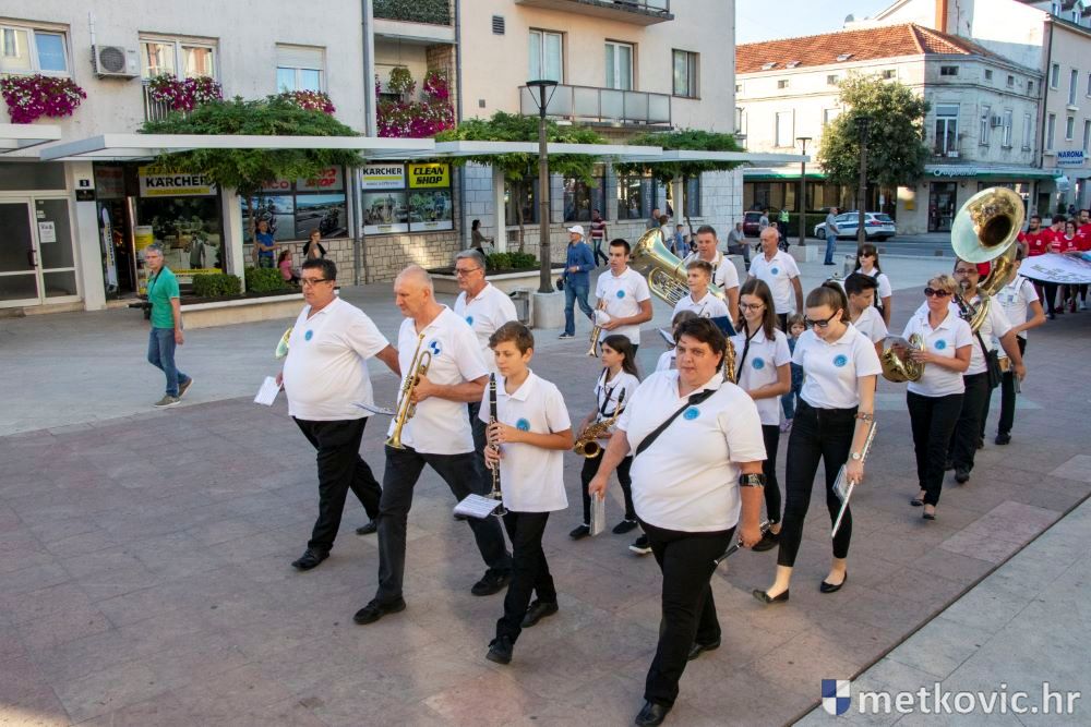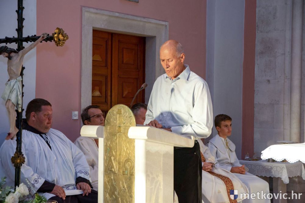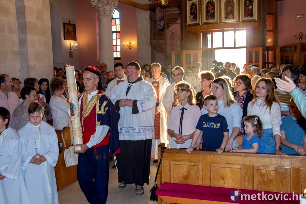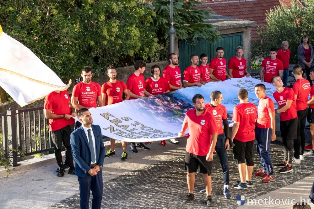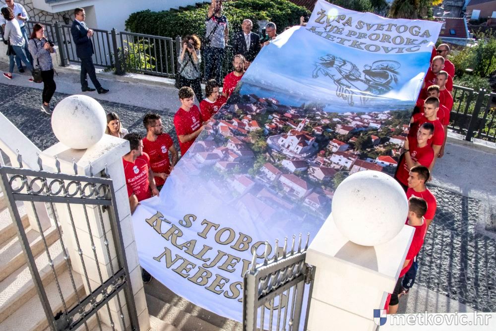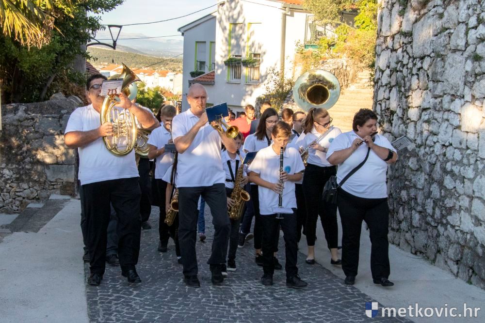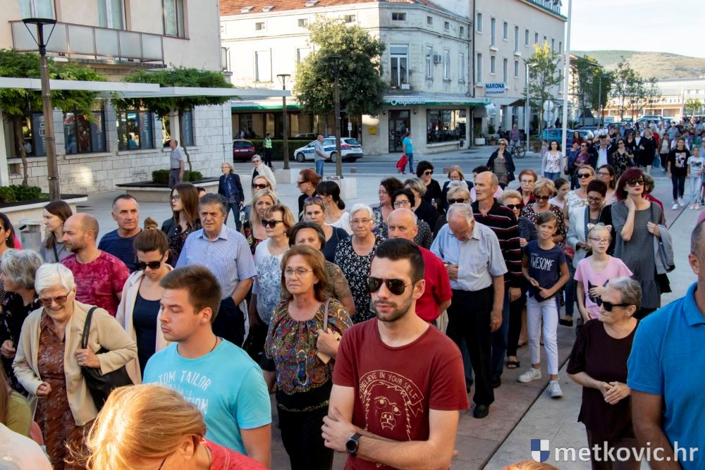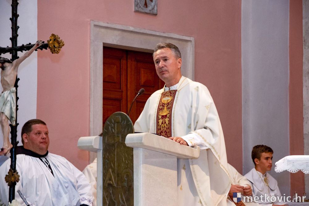 Praćeni građanima i Gradskom glazbom Metković potom su u mimohodu krenuli preko Trga i Ulicom Vladimira Nazora do župne crkve, pred kojom ih je čekao župnik fra Ante Bilokapić, koji je blagoslovio svijeću i zastavu. Zastava je nakon prigodne ceremonije izvješena na crkvenome zvoniku, a svijeća svečano unesena u crkvu. Potom je započelo misno slavlje, što ga je u suslavlju sa župnikom i župnim kapelanom fra Darijom Sinkovićem predvodio fra Šimun Bilokapić.