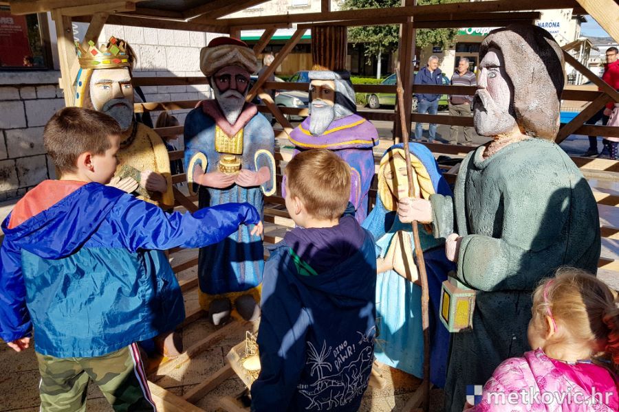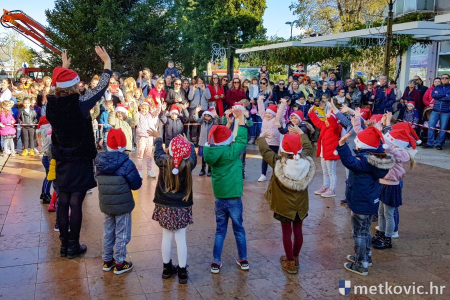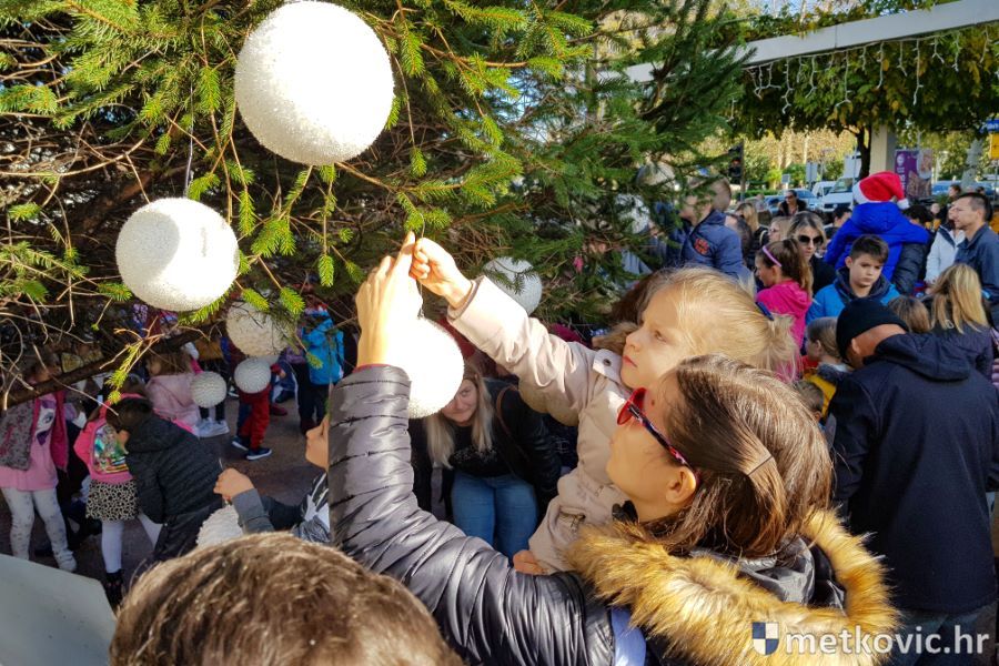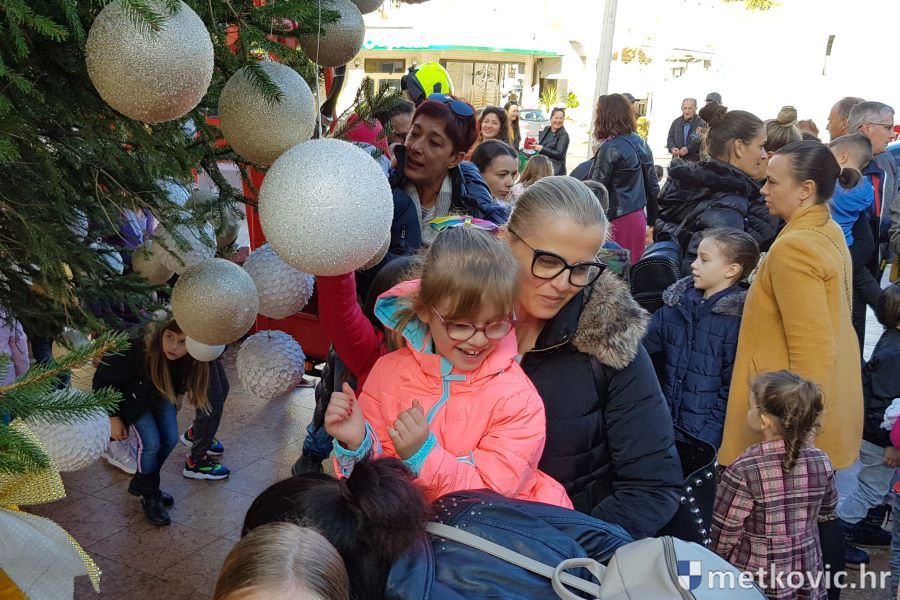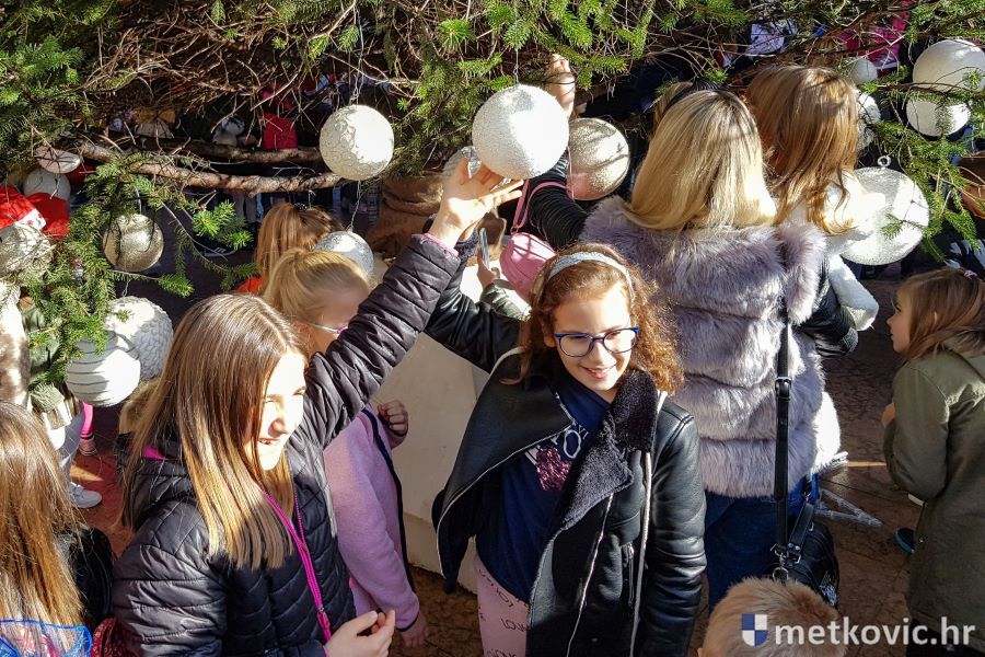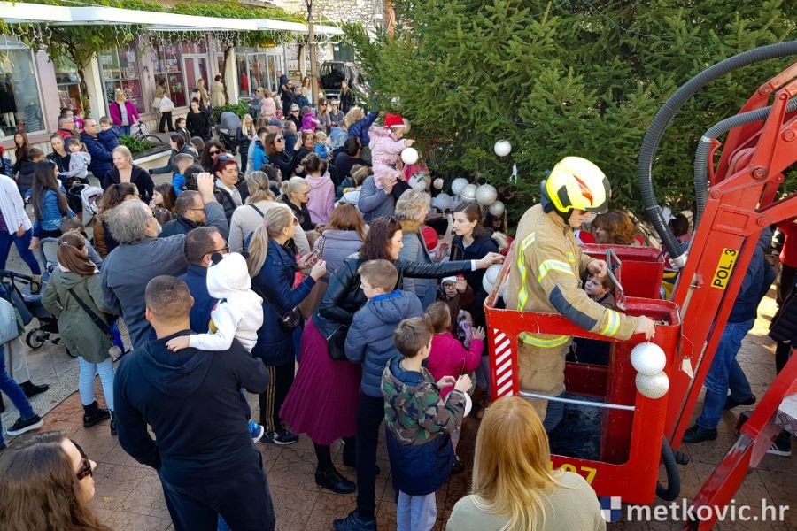 30.11.2019. - U organizaciji Turističke zajednice grada Metkovića jutros su djeca iz Dječjega vrtića Metković, DV Leut, DV Mali Isus i OŠ Stjepana Radića, uz pomoć metkovskih vatrogasaca, blagdanski ukrasila jelu na Trgu kralja Tomislava. Njima su se pridružili i štićenici Doma za odrasle osobe i rehabilitaciju Metković.