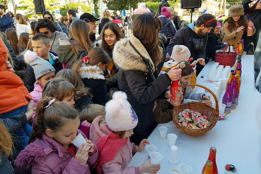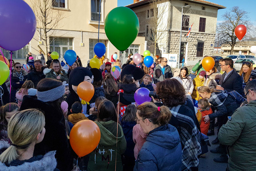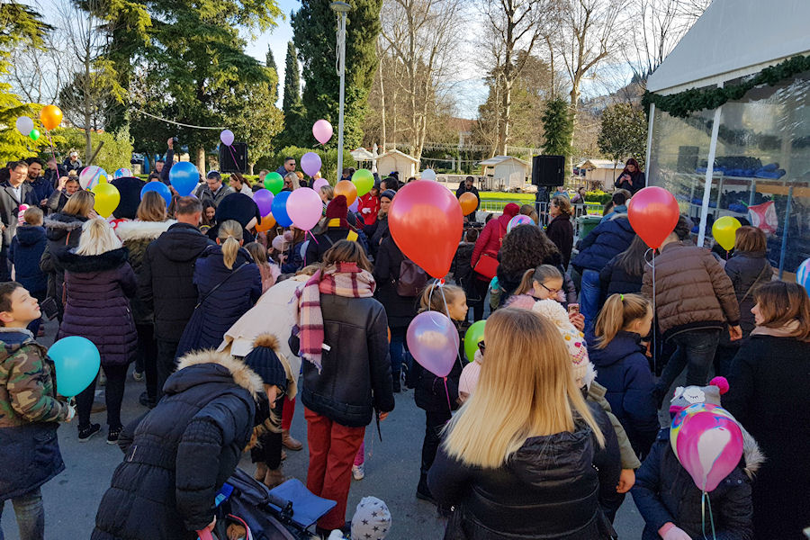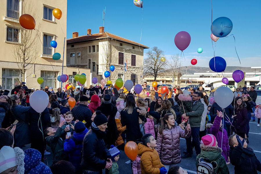 Metković, 31.12.2019. - Točno u podne na Trgu kralja Tomislava u zrak su poletjeli šareni baloni, nakon čega se nazdravilo dječjim šampanjcem. Tako su metkovski mališani u pratnji svojih roditelja dočekali Novu, jer, kako je red, kada ona dođe oni će biti u krevetu.