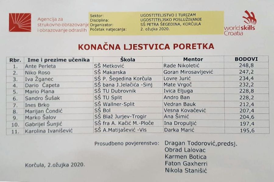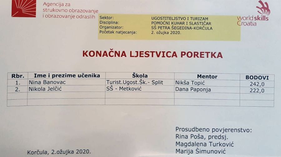 Ante Perleta iz ugostiteljskog posluživanja osvojio prvo mjesto (mentor Rade Nikoletić), dok je pomoćni kuhar slastičar Nikola Jelčić osvojio drugo mjesto (mentor Dana Paponja), a kuhar Tomislav Šutalo zauzeo je peto mjesto (mentor Vedran Perić). U disciplinama iz ugostiteljskog posluživanja i kuharstva sudjelovalo je dvanaest različitih škola i samo prva dva mjesta vode na državno natjecanje WORLDSKILLS U Zagrebu.