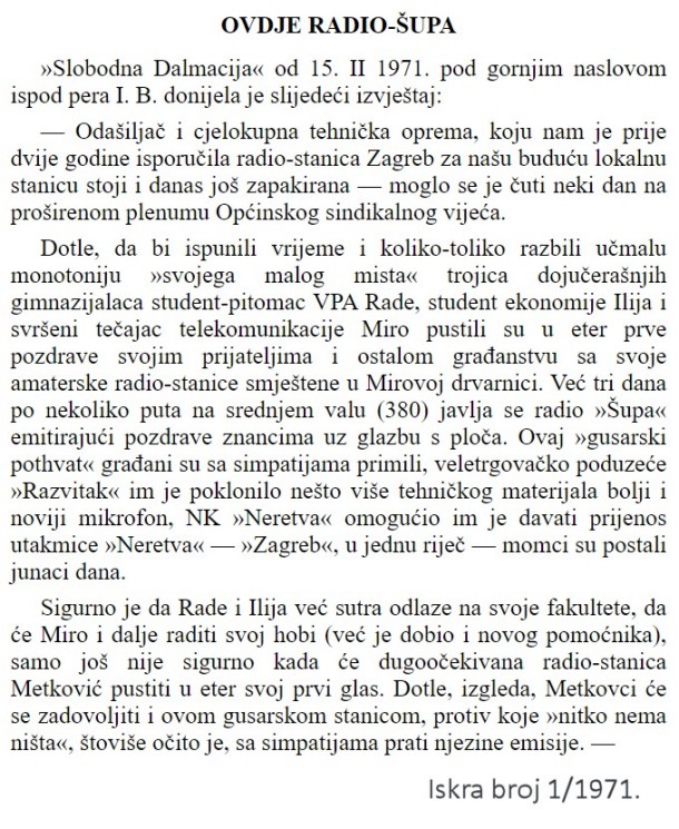 Prije 40 godina, kao novopečeni gimnazijalac, upoznao sam pok. Miru Orlovića koji je nekoliko mjeseci ranije bio maturirao. Viđao sam ga i prije kako s klincima iz susjedstva po Pržinama (danas Športska ulica) pušta svoje zmajeve oblakopenjače. Oni koji su ga poznavali složit će se sa mnom da je Miro bio osebujan čovjek. Bog mu je bio uzeo i dao preko mjere. Jako slaba vida i zdravlja općenito, Miro je bio zaljubljenik u elektroniku. Prva radijska postaja na ovim lokalnim prostorima nastala je u legendarnoj Mirinoj šupi pa je tako i dobila ime – Radio Šupa. Ta srednjevalna postaja svakodnevno je emitirala svoj lokalni program i ostvarila prvi izravan prijenos sportskoga događaja u Metkoviću. Ne sjećam se s kim je tada Neretva igrala, ali se sjećam da je s Neretvina igrališta do Mirine šupe u zgradi Bombaredela bilo razvučeno nekoliko stotina metara plavo-bijele telefonske žice, na čijem se jednom kraju nalazio najobičniji telefonski ugljeni mikrofon u koji je govorio legendarni Ivuša.