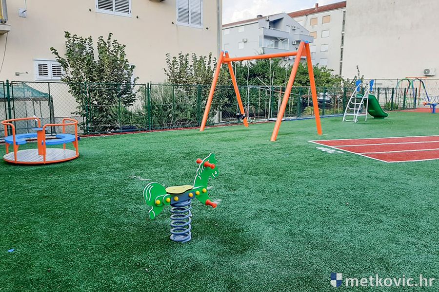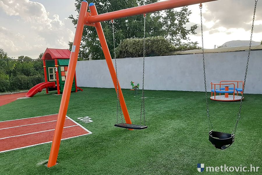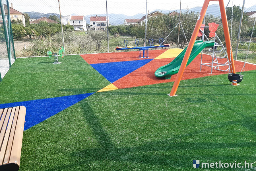 Na igralištu u Ulici Ante Starčevića postavljene su nove sprave i nova antistres podloga prilagođena standardima sigurnosti te, iznad nje, umjetna trava namijenjena dječjim igralištima.