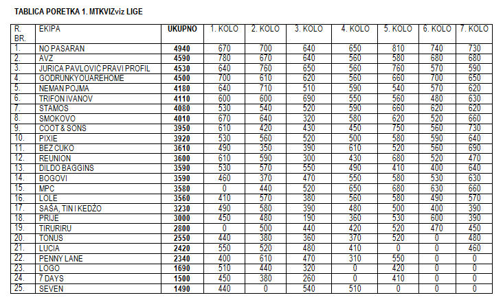 7.4.2016. - Završena je MTKviz liga u kojoj su u posljednjem, sedmom kolu prvo mjesto podijelili ukupni pobjednici No pasaran i Coot & sons, dok je treće mjesto pripalo ekipi Bež ćuko.