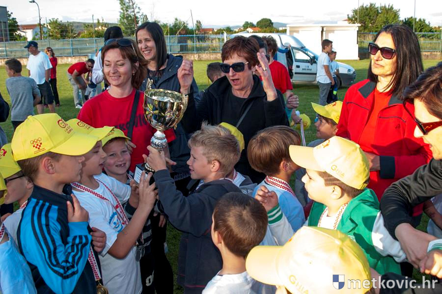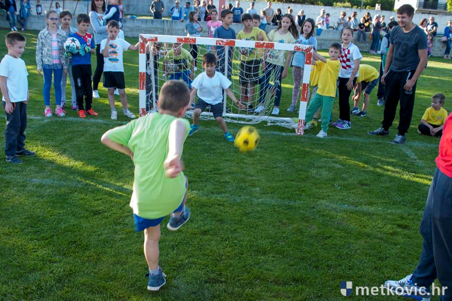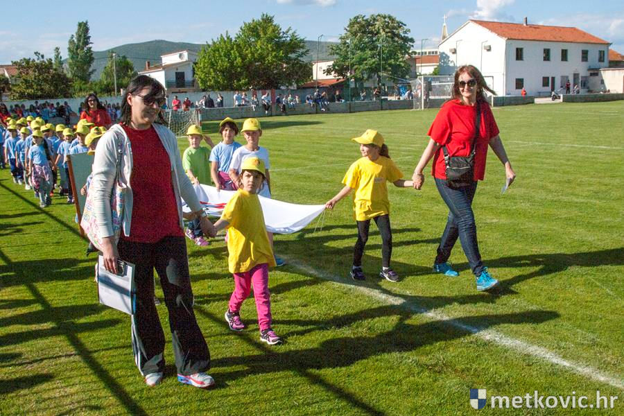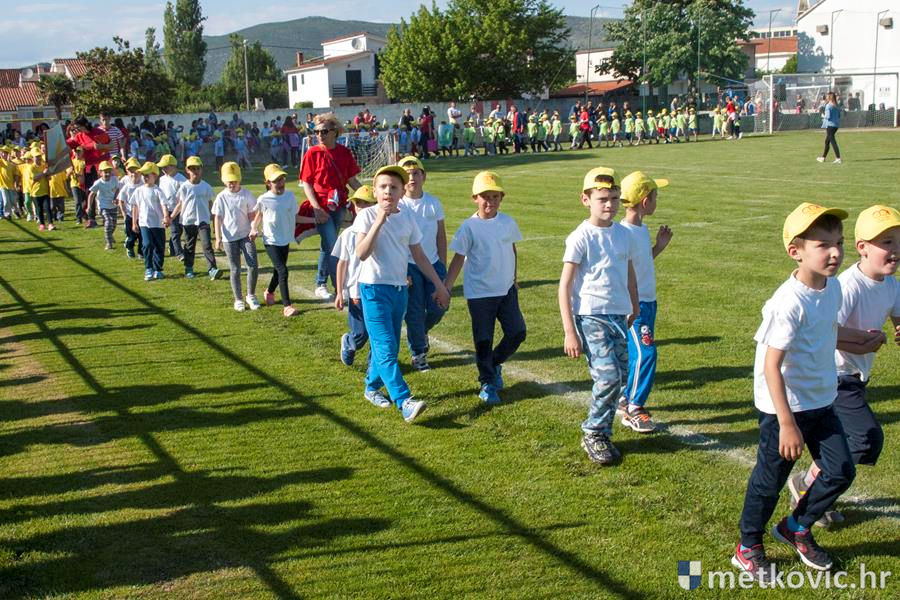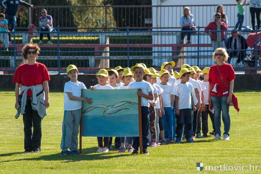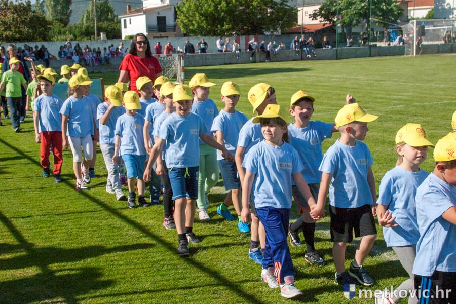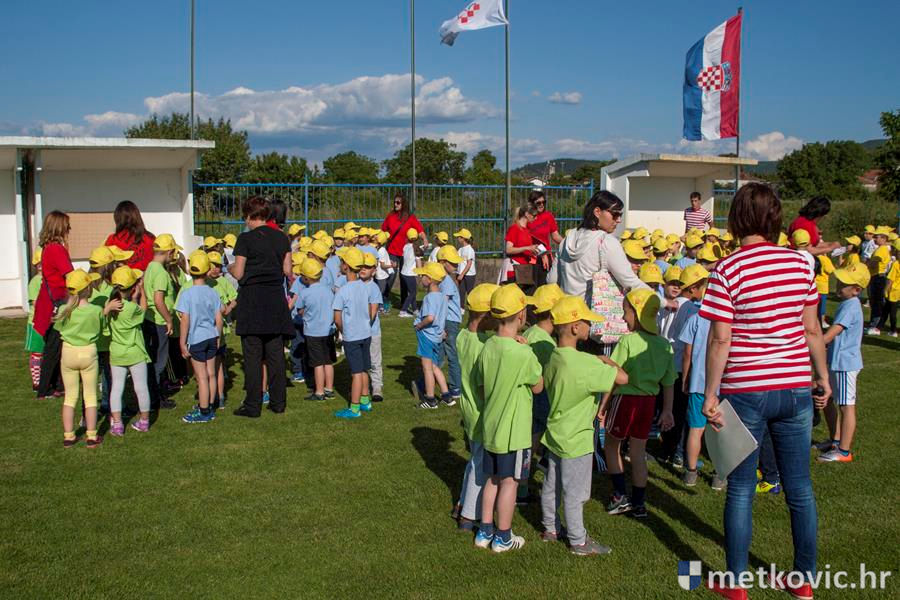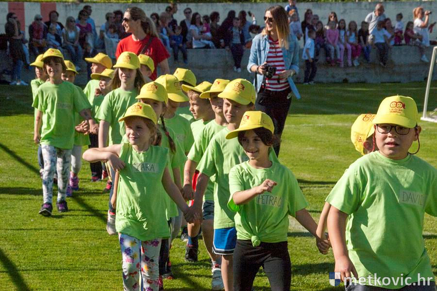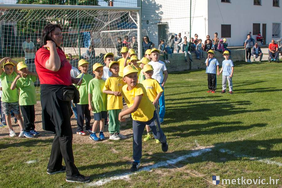 Četiri ekipe: Slavuji, Galebovi, Vjeverice i Žapci, svaka u svojim majicama i s kapama, natjecale su se u tima atletskim disciplinama: trčanju na 50 m, skoku udalj s mjesta i bacanju loptice, s time da su se odvojeno natjecali dječaci i djevojčice, a na kraju je uz bučno navijanje odigran malonogometni turnir.