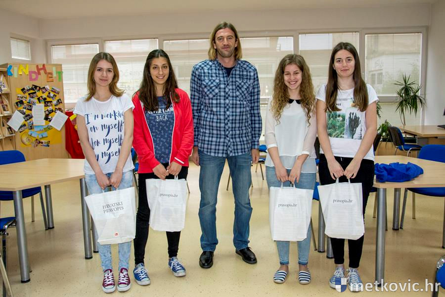 25.5.2016. - Domagoj Vidović s Instituta za hrvatski jezik i jezikoslovlje jučer je posjetio Gimnaziju Metković i uručio knjige četirima učenicama koje su početkom svibnja sudjelovale na državnom Natjecanju iz poznavanja hrvatskoga jezika.
