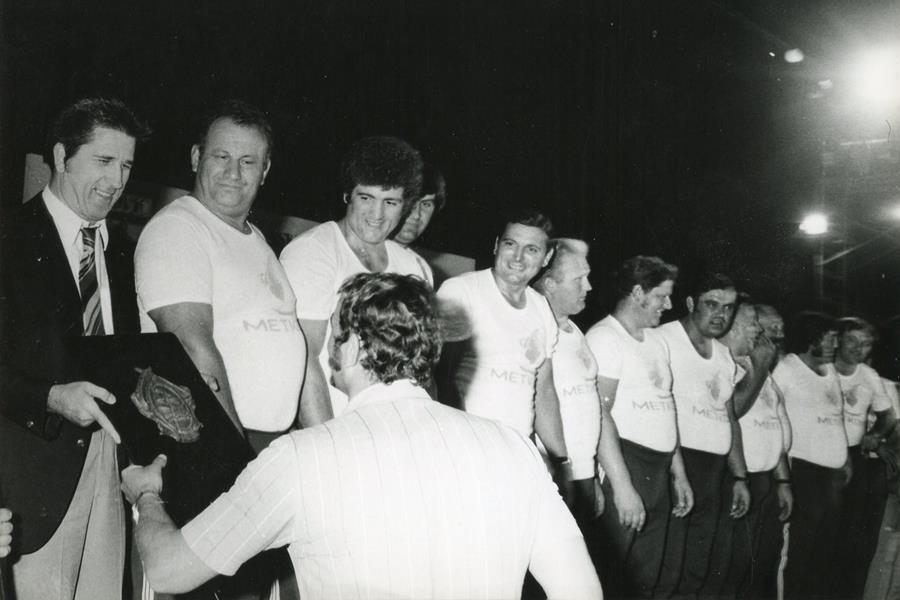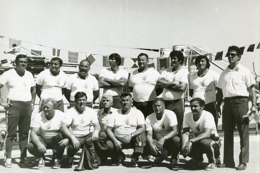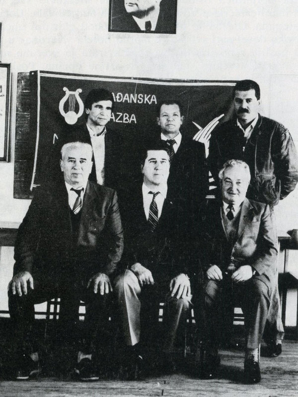 Članovi Uprave Građanske glazbe Metković 1985. godine. Slijeva nadesno sjede: Ivo Gabrić (tajnik), Pero Jurjević (predsjednik) i Aleksa Vištica. Stoje: Ante Martinac, Ivo Brljević i Miće Volarević