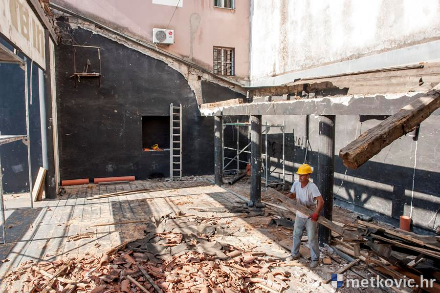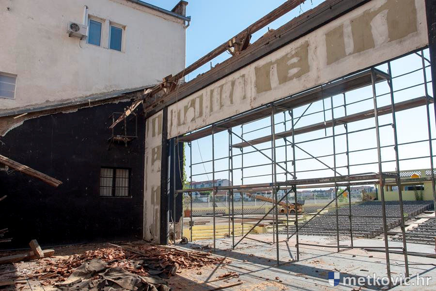 29.7.2016. - Odmiču radovi na sanaciji ljetne pozornice uz Neretvu. Raskriveno je krovište i skinuta stara akustična školjka, a obavljeni su i betonski radovi na podu pozornice.