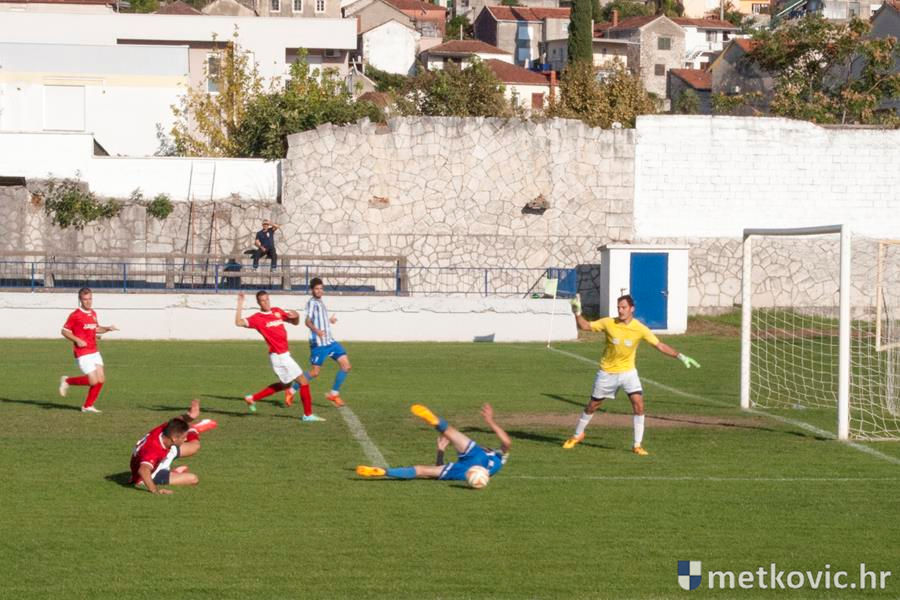 Prvo poluvrijeme obje su ekipe odmjeravale snage u čvrstim dvobojima na sredini terena, no bliže šesnaestercima stvorile su tek nekoliko prilika za udarce prema vratima. Sportska se sreća nasmiješila domaćinu u 42. minuti susreta, kada gosti u svome šesnaestercu rade prekršaj, na što je sudac Ante Žilić pokazao na bijelu točku. Uspješan izvođač kaznenoga udarca bio je bio je Frane Jerković koji je loptu uputio nisko i precizno te svladao gostujućega vratara. Rezultatom 1:0 završeno je prvo poluvrijeme utakmice.