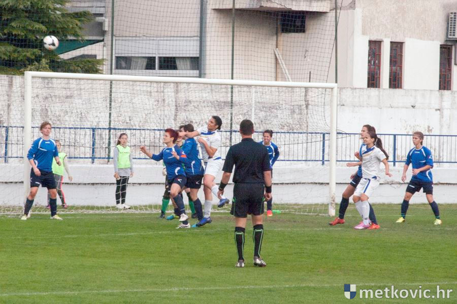 Hladan tuš za domaće nogometašice uslijedio je veću u 3. minuti kada su gošće pogotkom Sanje Herman povele 0:1. Metkovke to nije obeshrabrilo pa su zapele na terenu i već u 11. minuti na 1:1 izjednačile pogotkom Helene Perić. Tim se rezultatom otišlo se na predah.