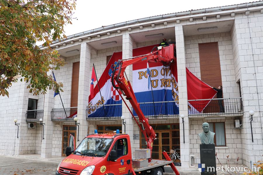 25.11.2016. - U tijeku su posljednje pripreme za veliku proslavu 25. obljetnice ustroja 116. brigade Hrvatske vojske. Jutros je na pročelje Gradskoga kulturnog središta postavljena dvadesetmetarska zastava koju su veterani IV. gbr. nedavno nosili u Koloni sjećanja u Vukovaru.